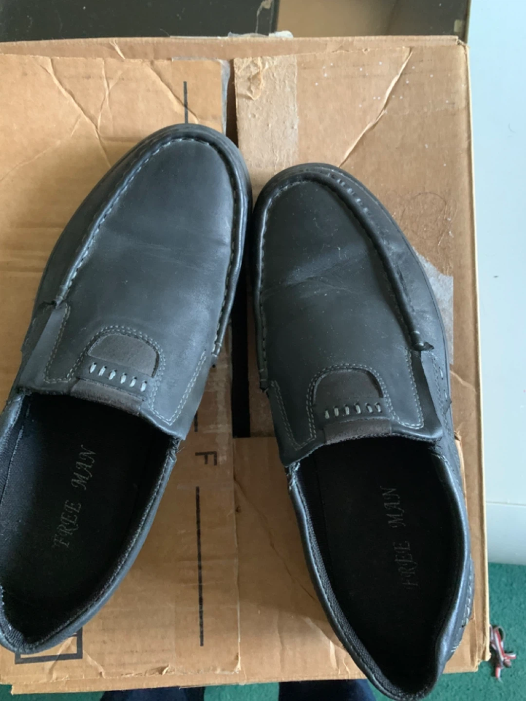 Selling a pair of Free Man black leather slip-on shoes. They're in good condition and ready for a new home! Perfect for everyday wear or casual outings.
