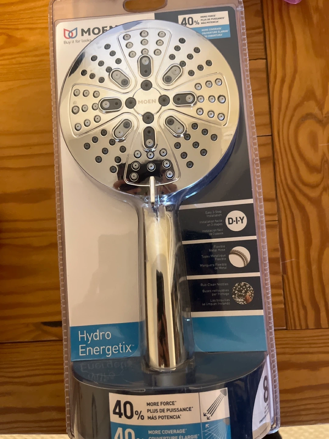 Selling a brand new Moen Hydro Energetix shower head! It's still in its original packaging and ready to install. Enjoy more force and coverage with this easy 3-step installation shower head. It also features flexible metal hose and rub-clean nozzles
