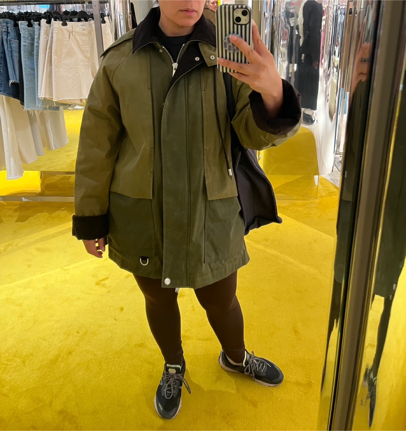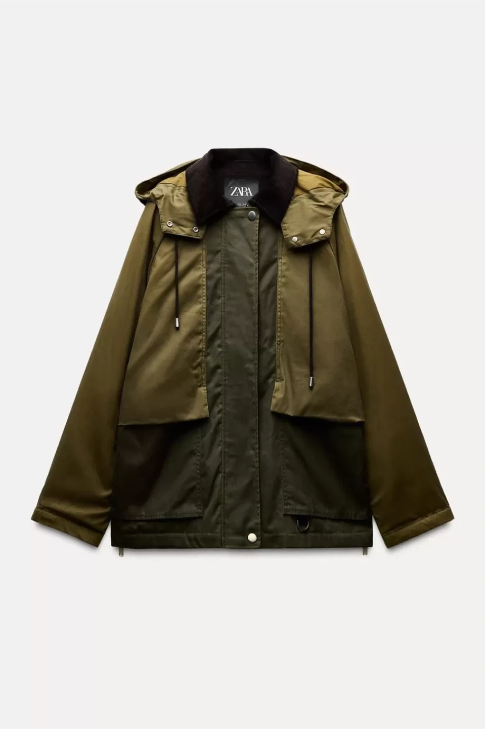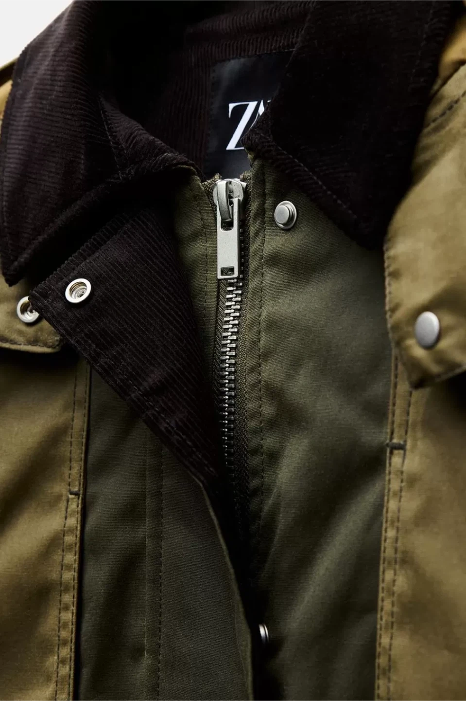 Here's a Zara jacket in olive green. It has a corduroy collar and a zipper closure. It's in great condition and ready for a new home