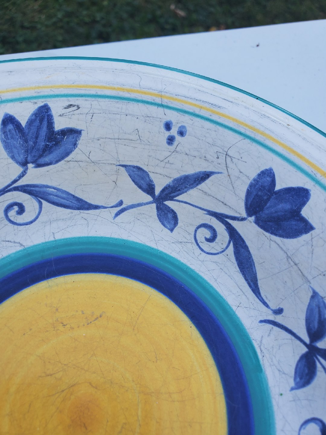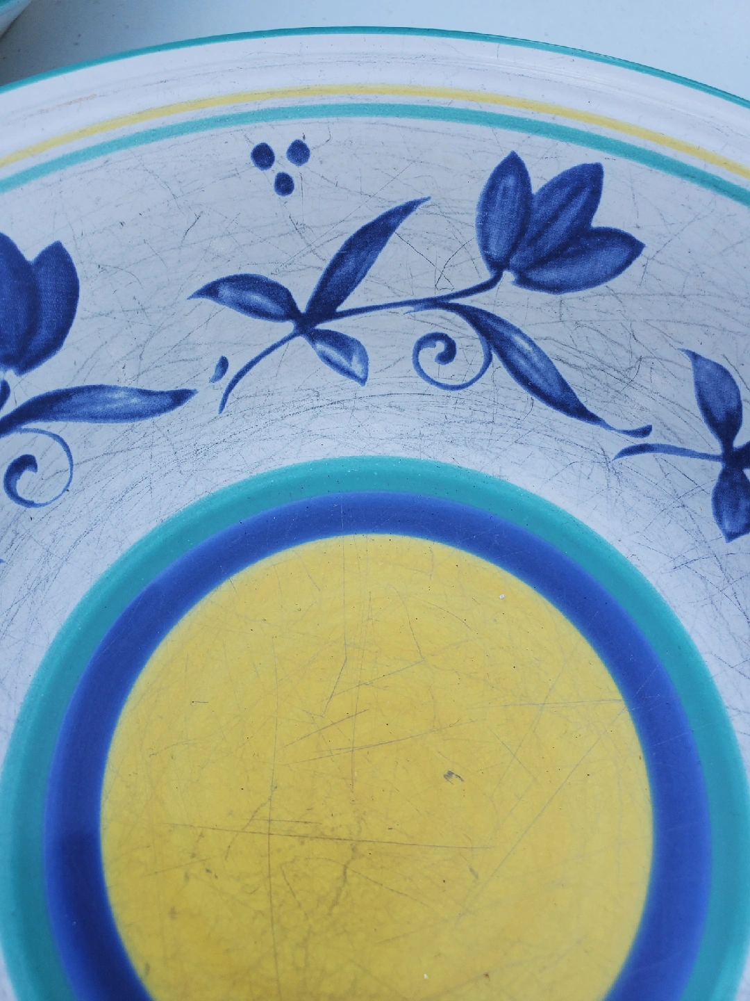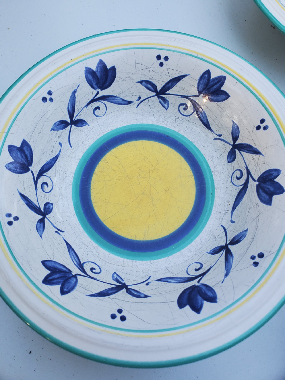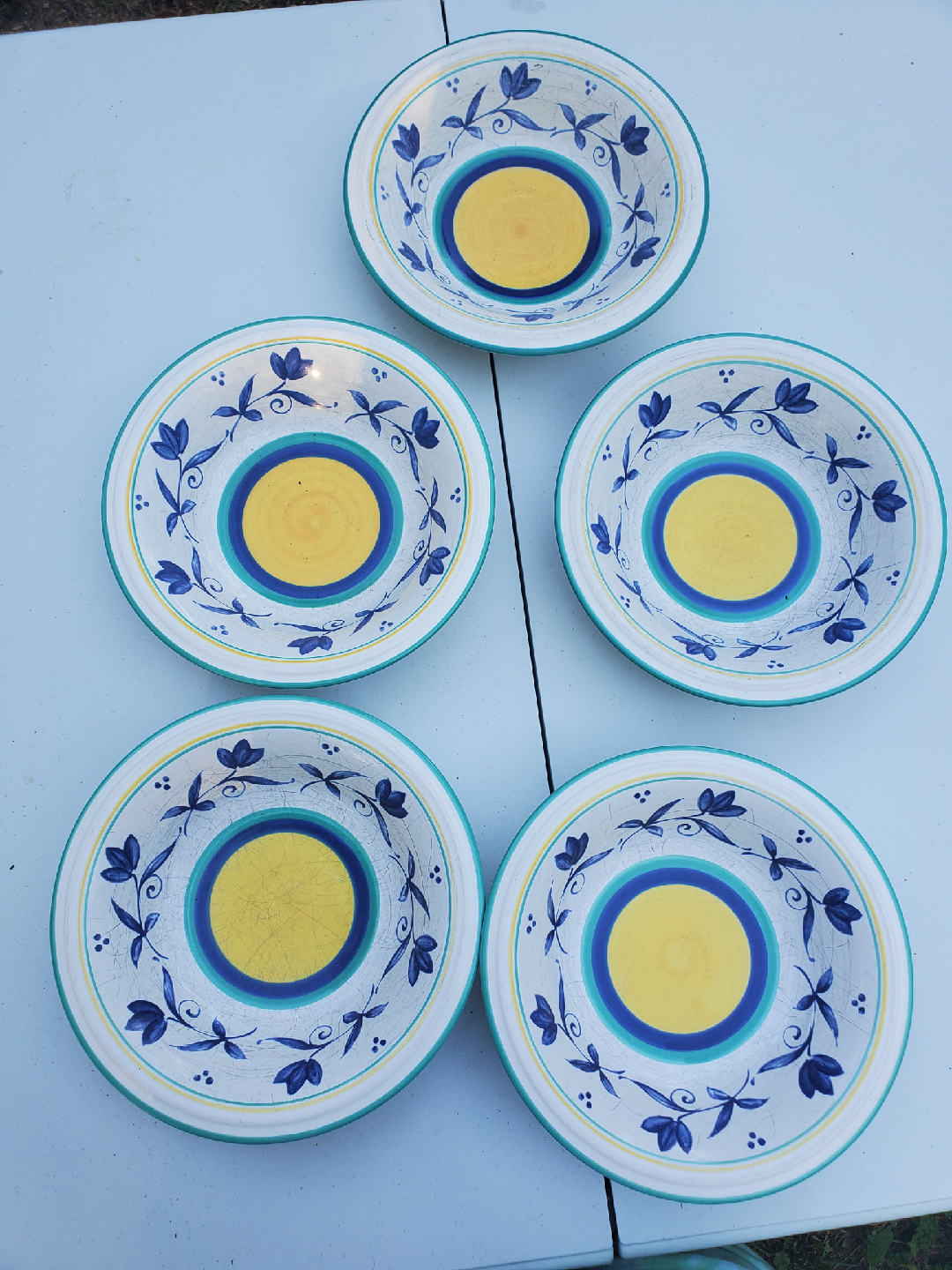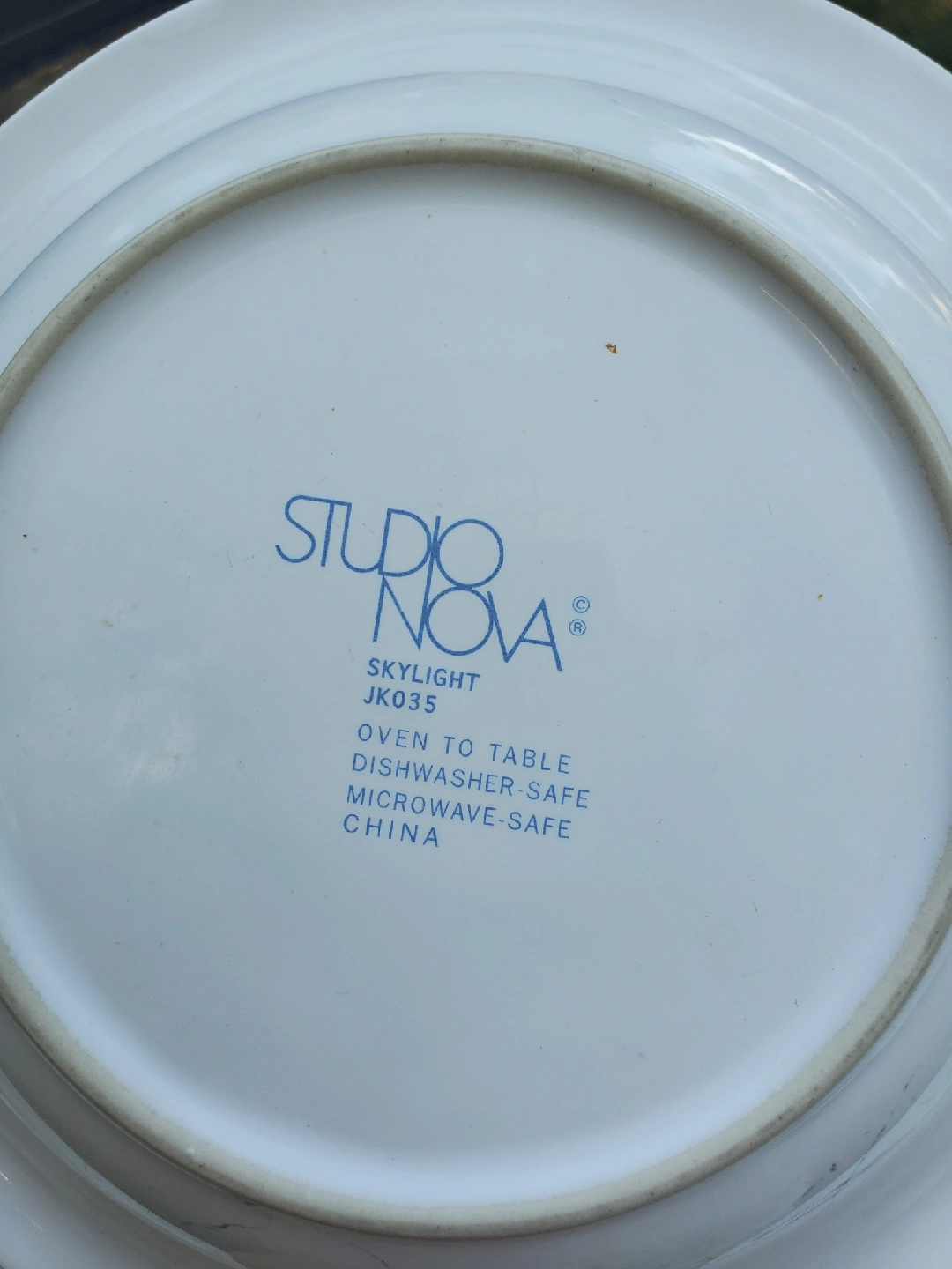 Selling a set of 5 Studio Nova Skylight JK035 plates. They feature a lovely floral design with blue flowers and a yellow center. These plates are oven-to-table, dishwasher-safe, and microwave-safe. They are made in China. have lots of scratches and crazing, see photos.