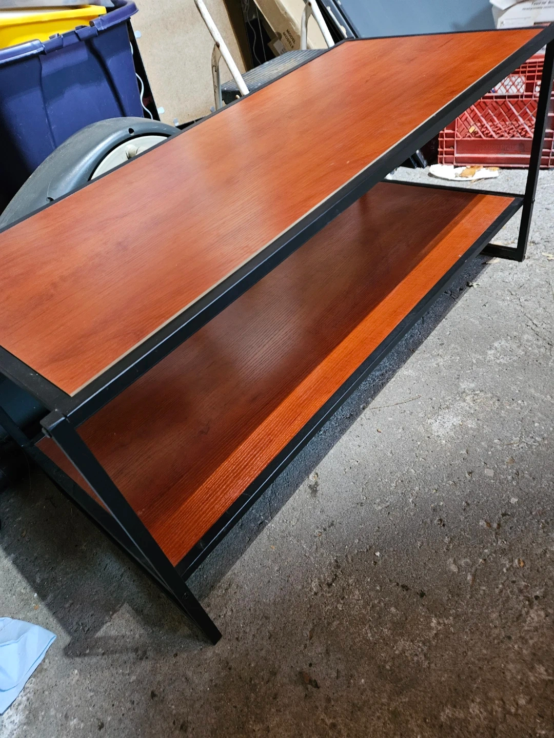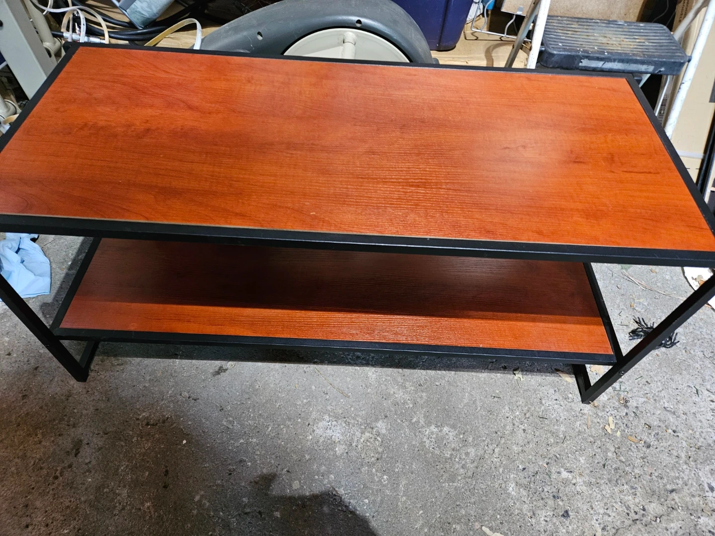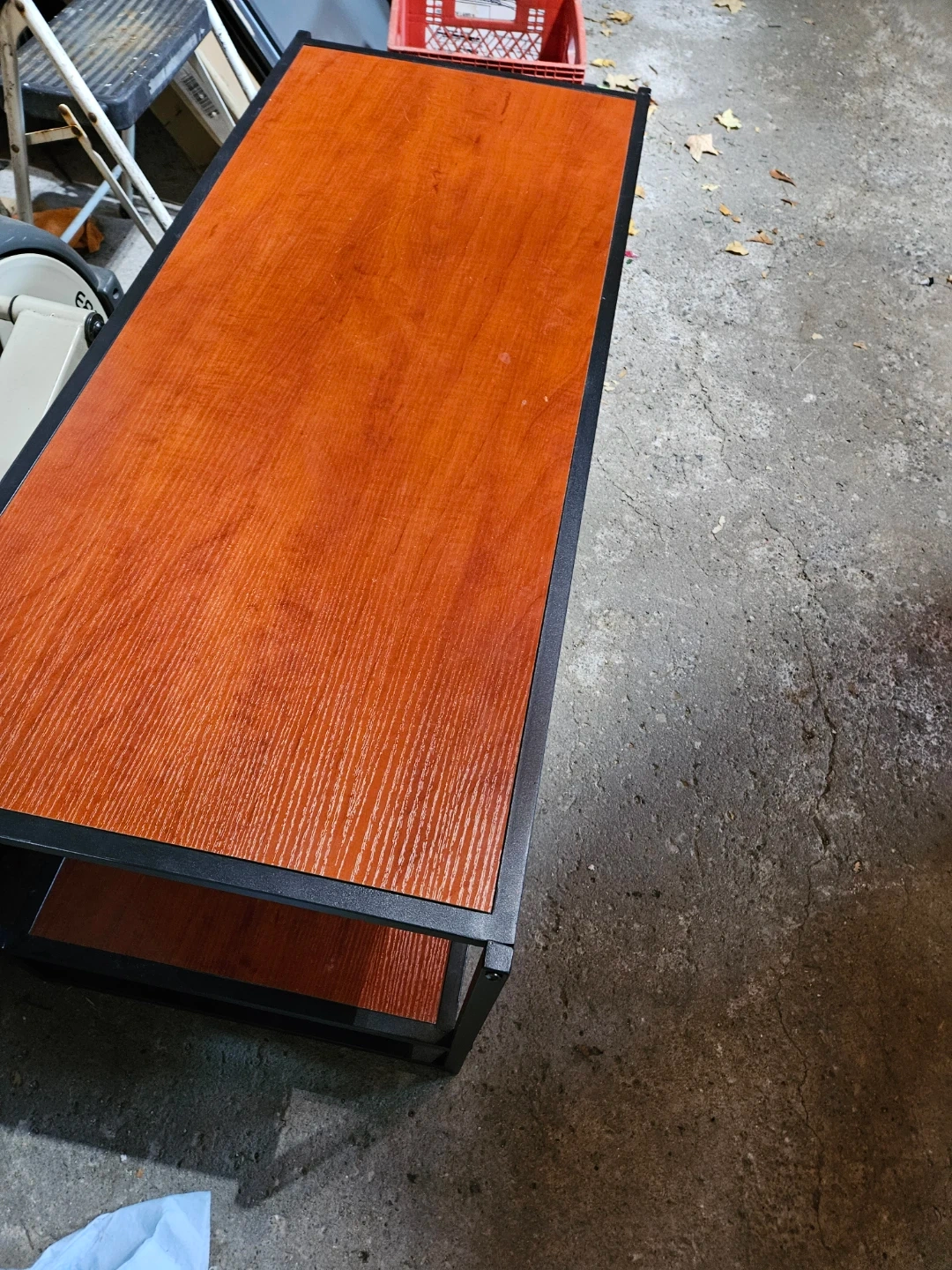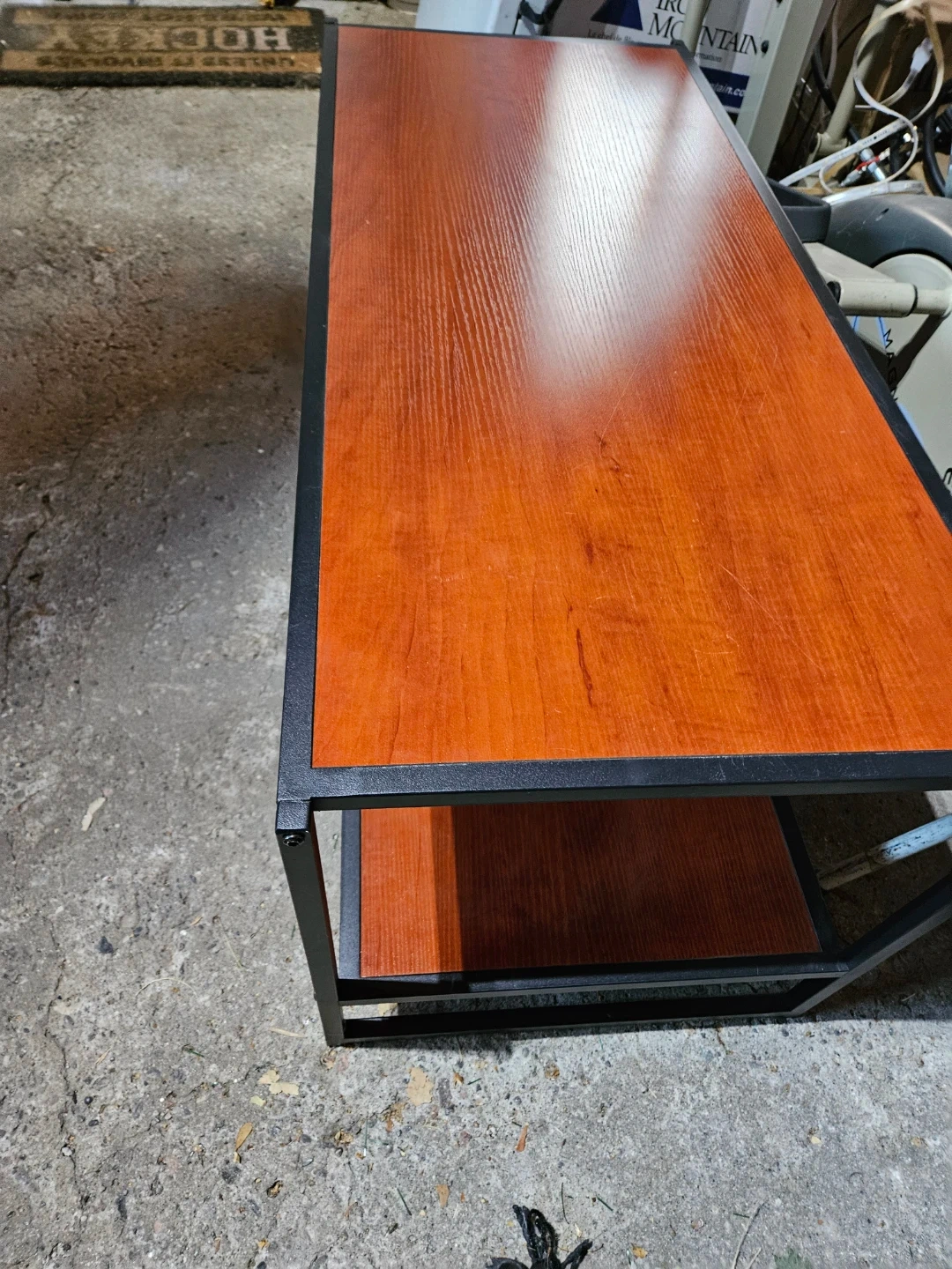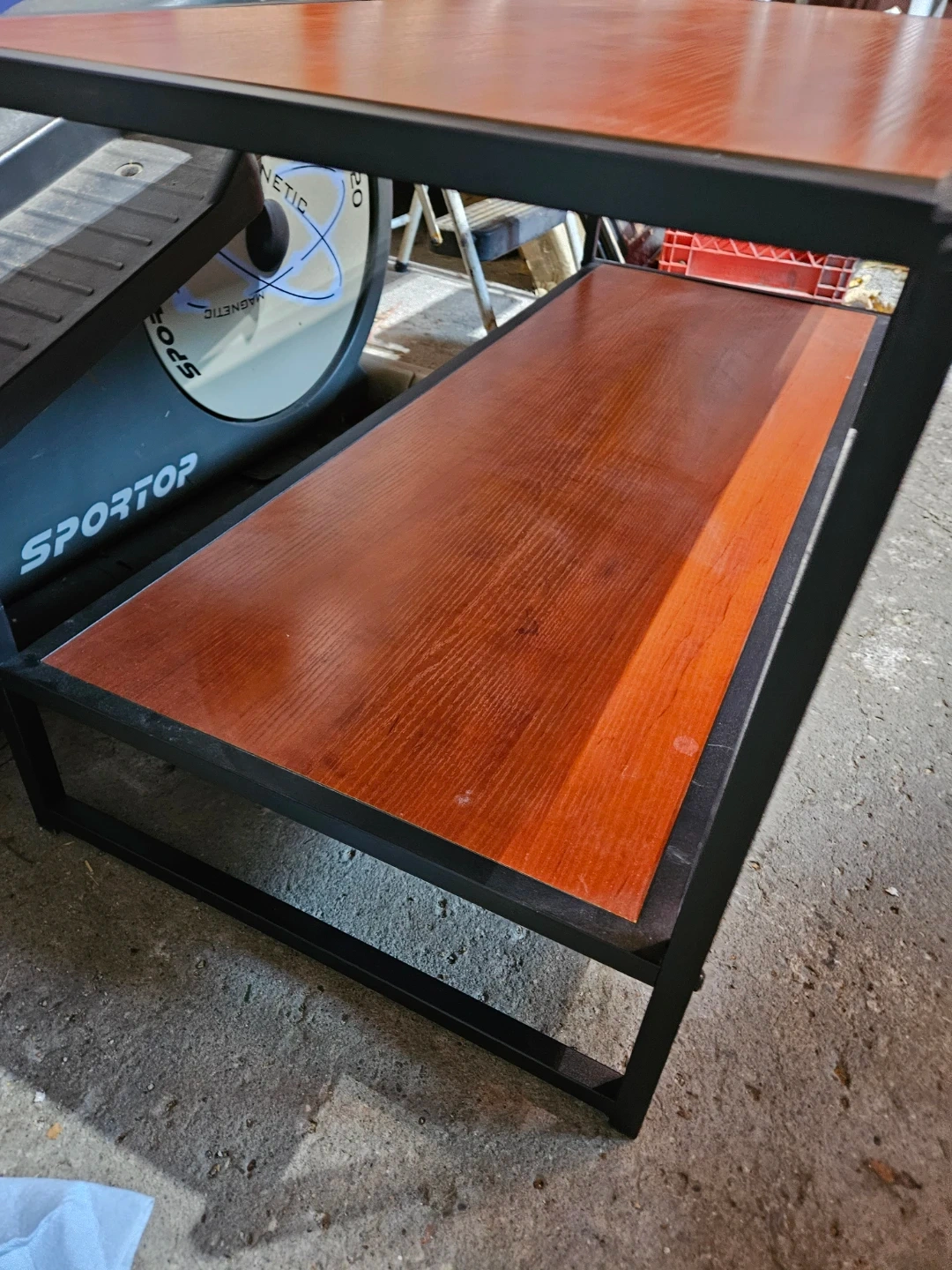 Selling a coffee table with a wood top and a metal frame. It has a shelf underneath for extra storage. It's in good condition and would look great in any living room