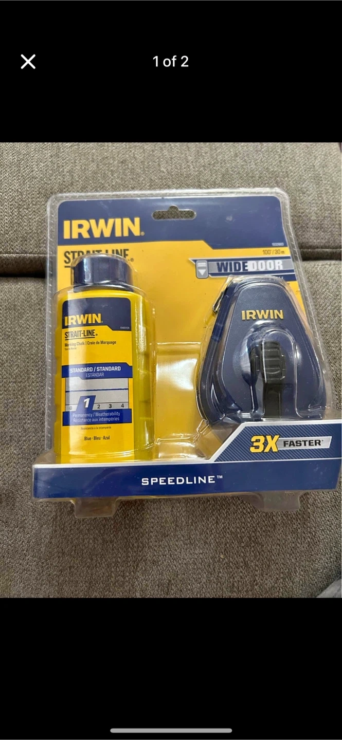 Selling a brand new Irwin Strait-Line marking chalk reel kit! It features a wide door and Speedline technology, making it 3x faster. The chalk is blue, and the set includes the chalk reel and a bottle of marking chalk. Perfect for your next project!