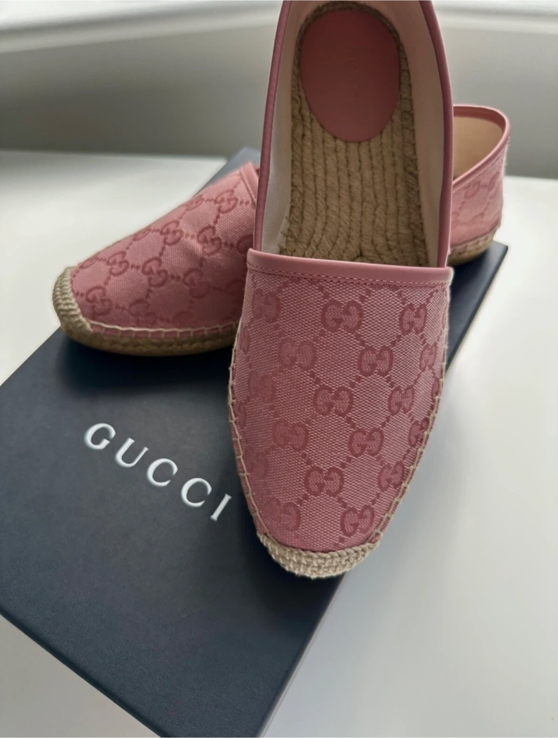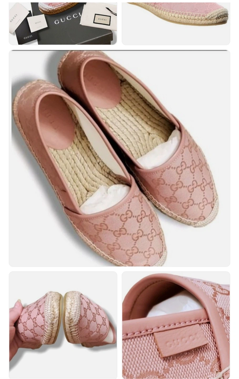 Selling a pair of Gucci espadrille flats in a lovely pink colour! These are a size 6,5 and come with the original box. They feature the classic Gucci logo pattern. Perfect for adding a touch of luxury to your everyday style!