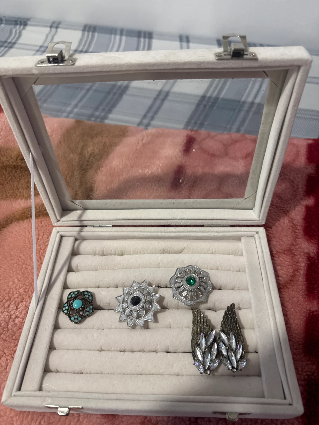 Selling a set of costume jewellery! It includes a few rings brand new adjustable. The pieces are silver-toned and feature various stone accents. Comes in a display box!