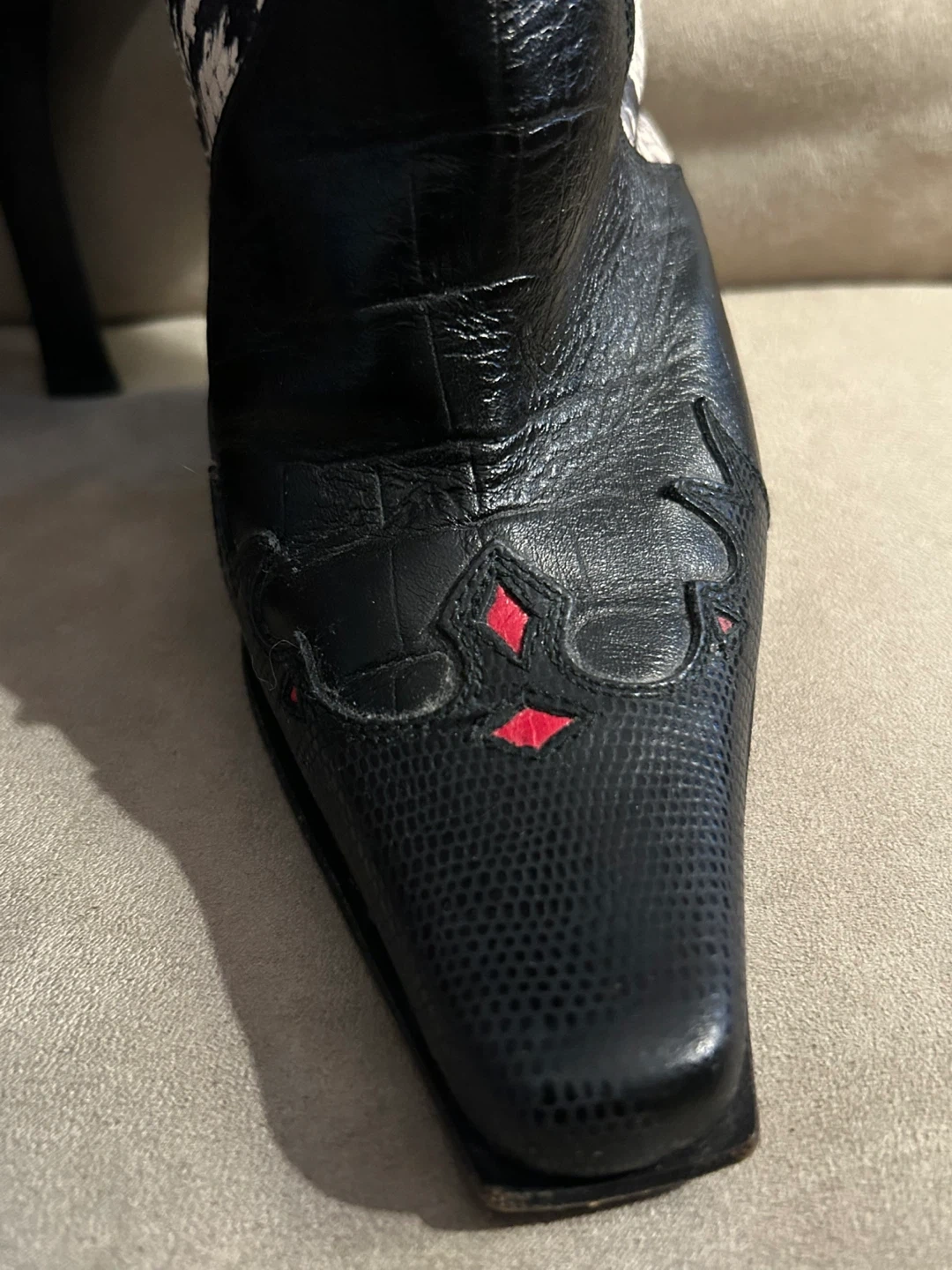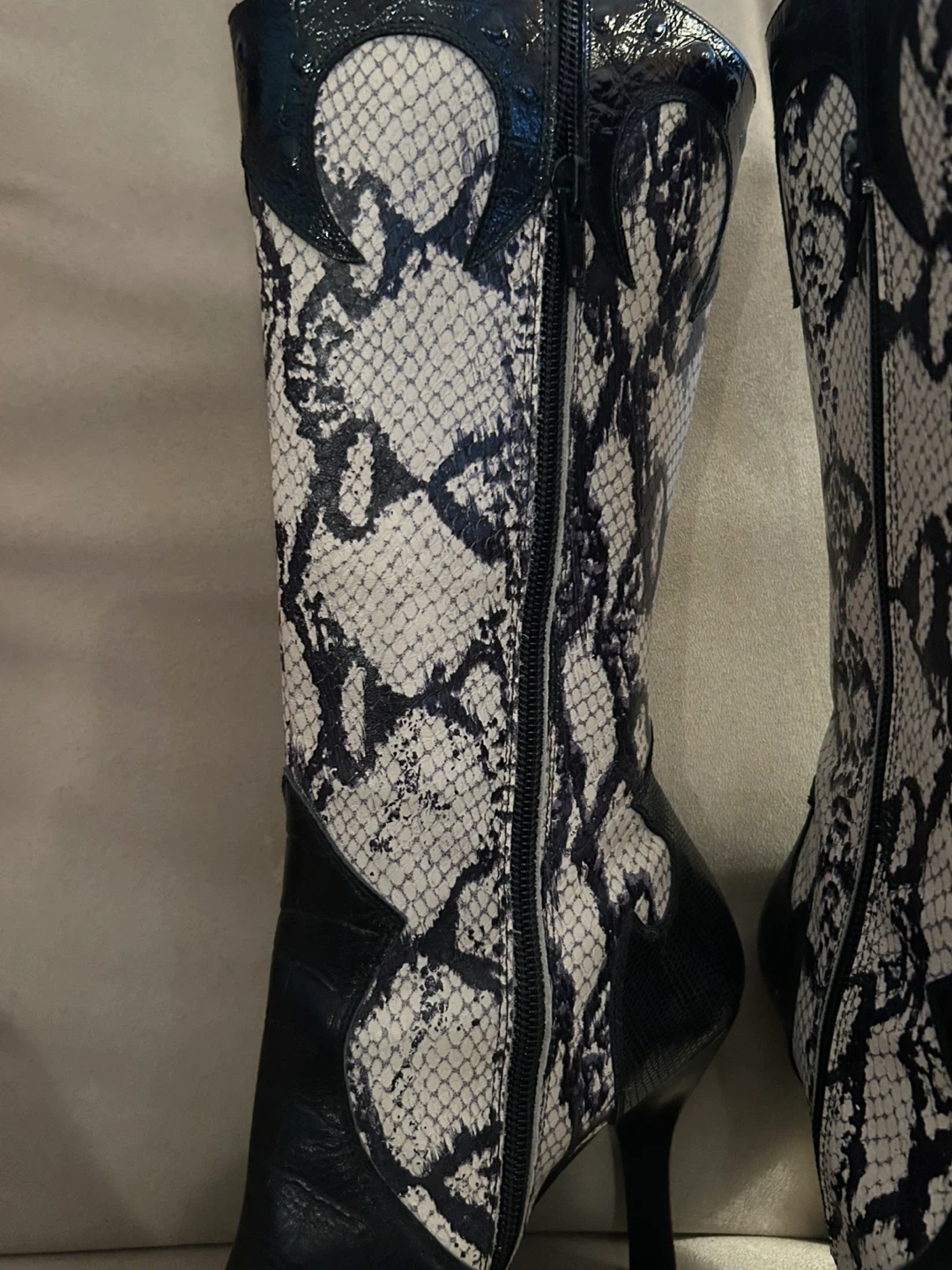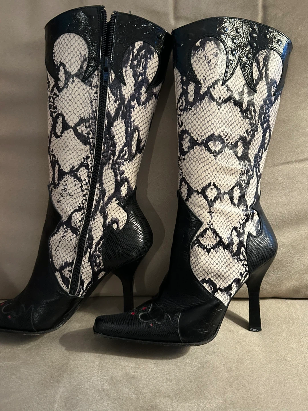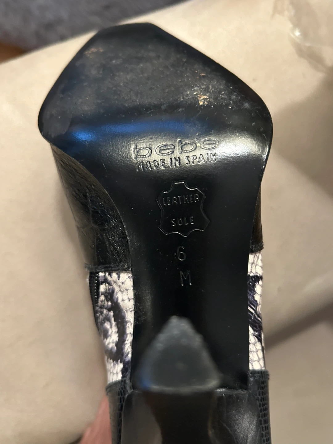 Selling a pair of Vintage Bebe black and white faux snakeskin-patterned elegant heeled boots. Size 6 and made in Spain. They have a unique design with black leather accents and a stylish heel. A hint of red in the toe pattern. Perfect for adding a touch of elegant flair to your wardrobe! Minimal wear on sole. Barely worn.