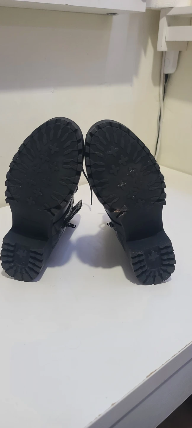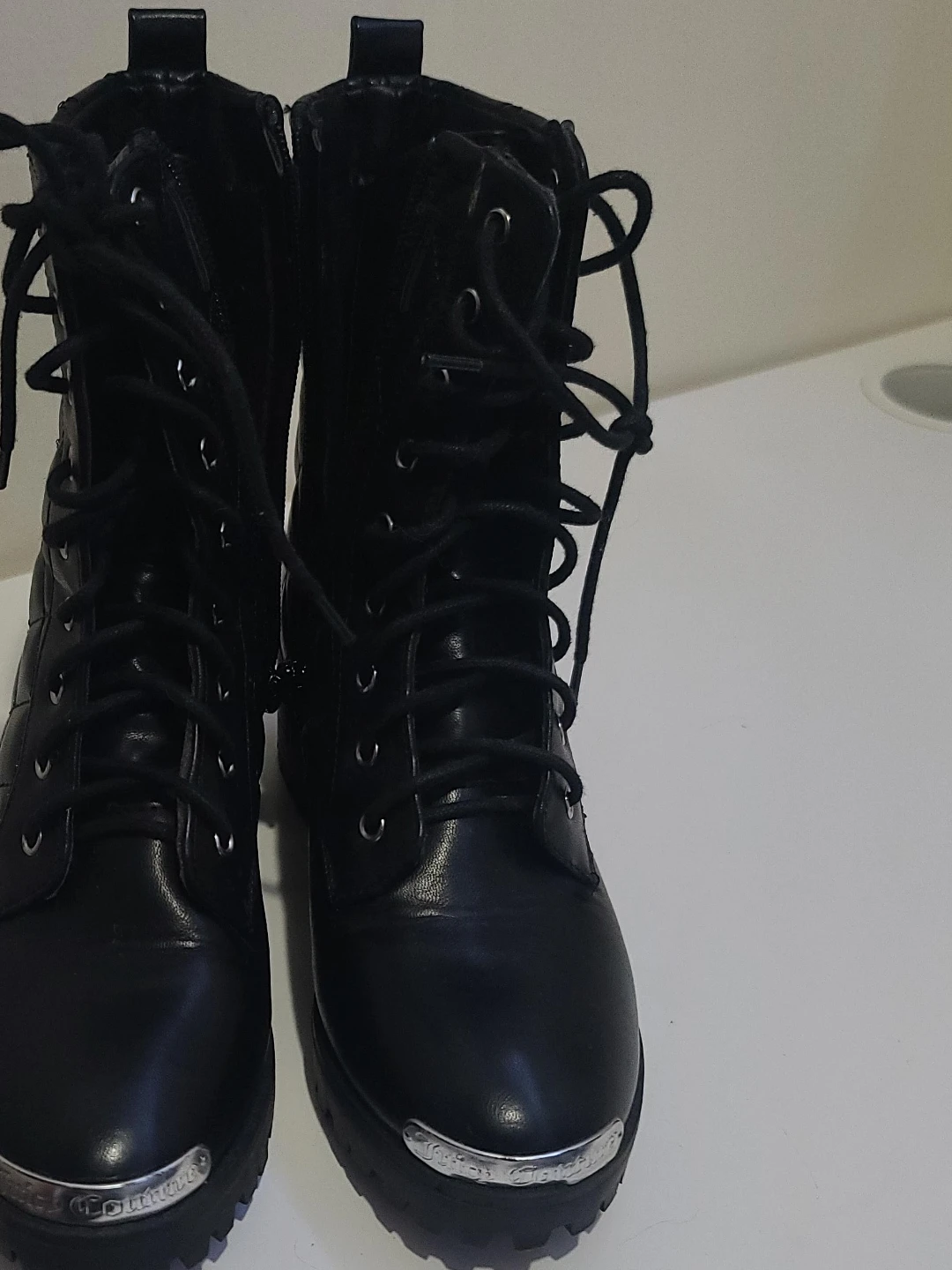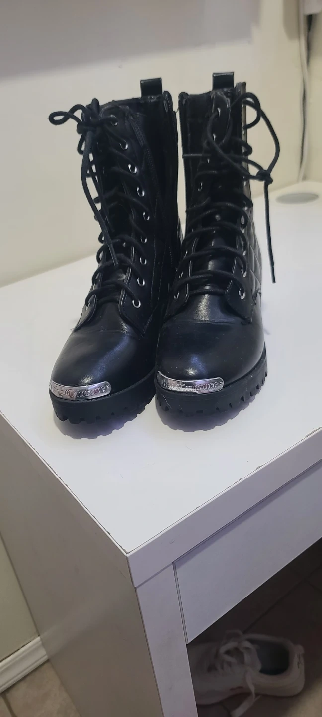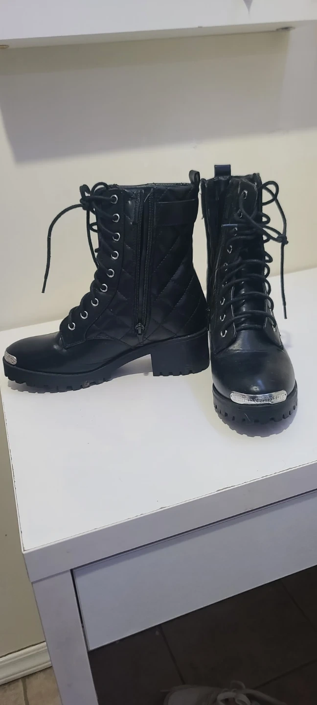 These are a pair of Guess black combat boots with a quilted design. They feature lace-up detailing and a side zipper for easy wear. The boots have a chunky heel and a lug sole for added traction. They show some signs of wear but are still in good condition.