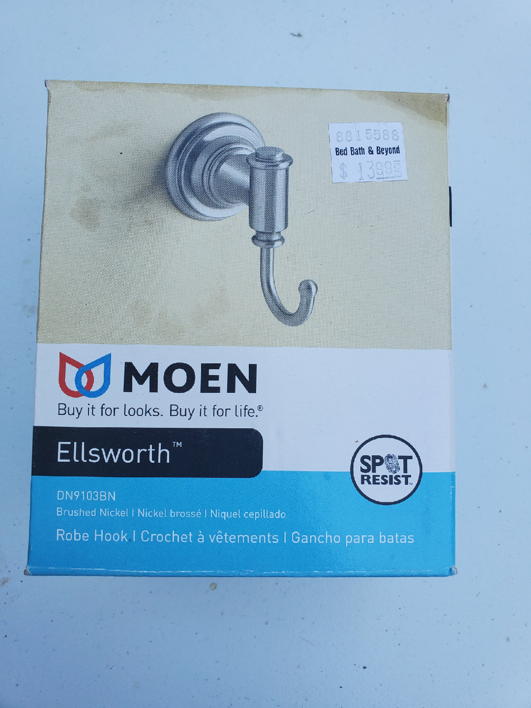 Selling a Moen Ellsworth robe hook in brushed nickel. This robe hook features spot resist. Originally bought for $13.99 at Bed Bath & Beyond. Model number is DN9103BN