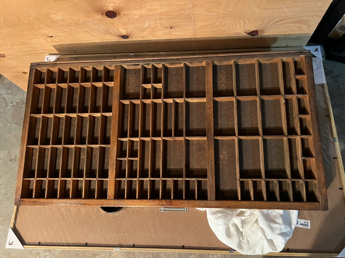 Here's a vintage wooden letterpress tray, perfect for organizing small items or displaying collectibles! It has a lovely rustic look and would make a unique addition to any home or studio