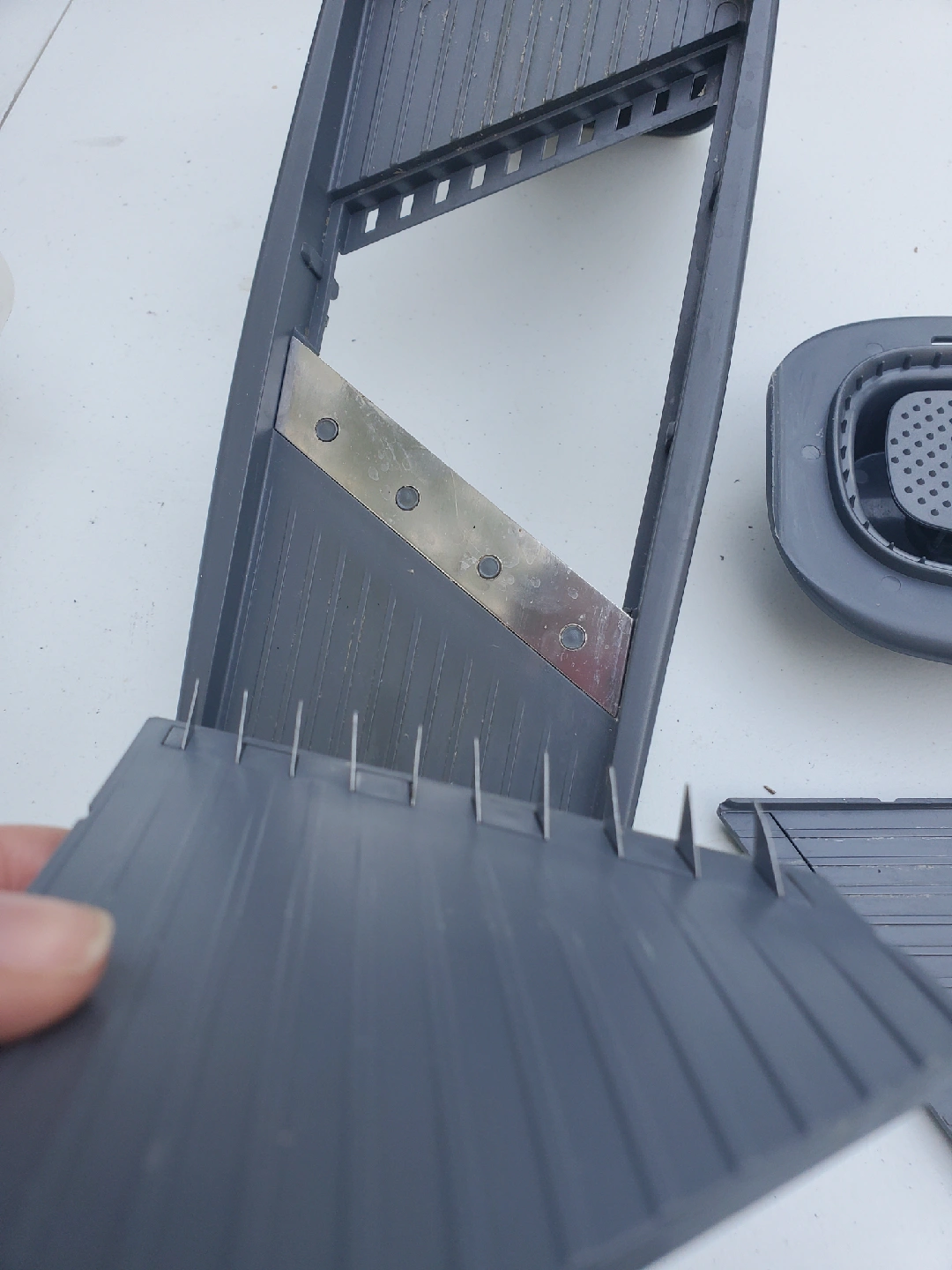 I'm selling an adjustable mandoline food slicer. It has settings for both thick and super thin slices. Great for getting consistent cuts in the kitchen!