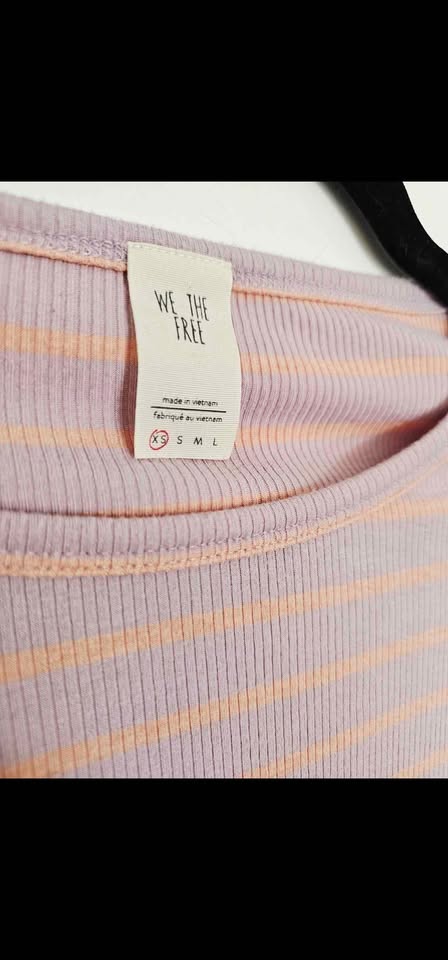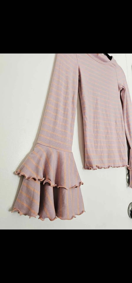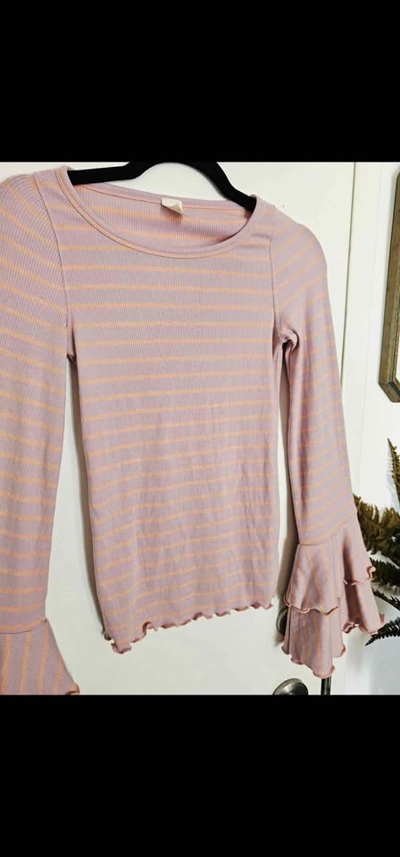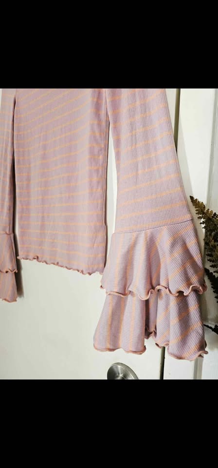 Chic striped Good Finds long sleeve top featuring elegant ruffled bell sleeves, from Free People brand We The Free. Top is light lilac purple with light coral pink/ orange stripes, and has lettuce hems. It is super soft!