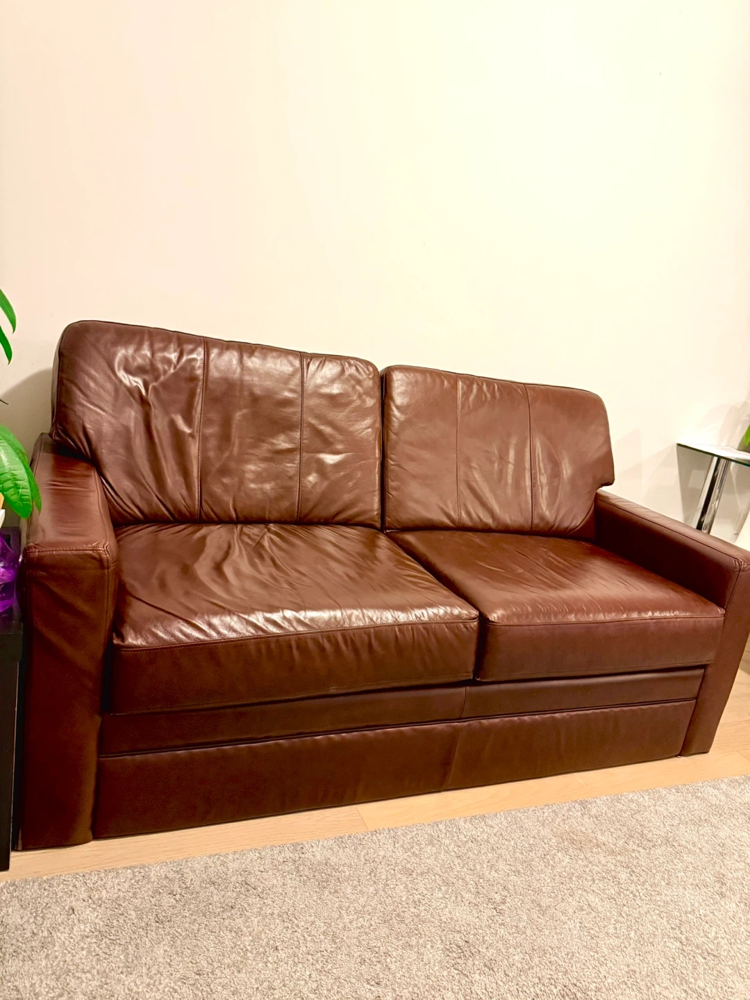 Selling a La-Z-Boy genuine leather sofa bed in brown. It's in good condition and would be a great addition to any living room or den. Perfect for guests or just lounging around! Super soft and comfortable, can even be used as a bed because of how good the mattress feels! The leather ottoman with storage inside will be included too!