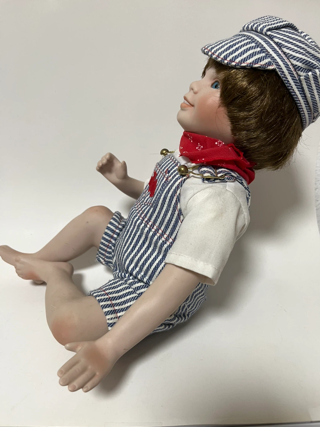 This is an Edwin M Knowles porcelain doll from 1990. It features a blue and white striped outfit with a red bandana. The doll is in good condition.