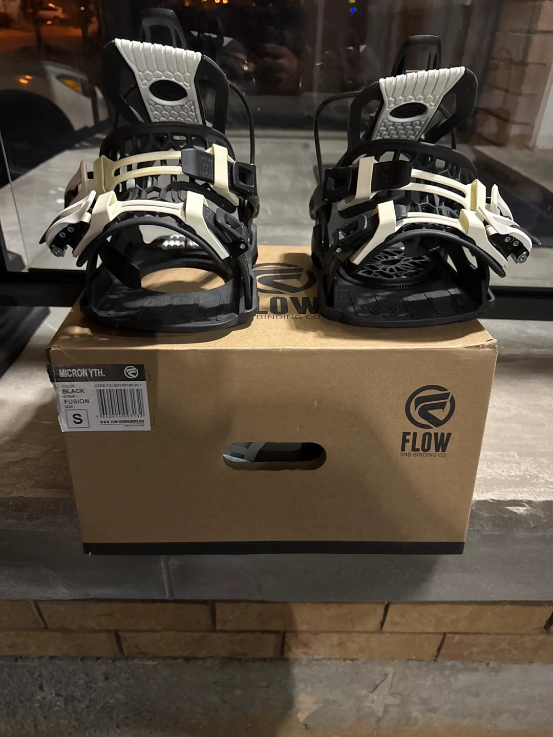 Selling a pair of Flow Micron Youth snowboard bindings in size small. They come in black with a Fusion strap. The original box is included!
