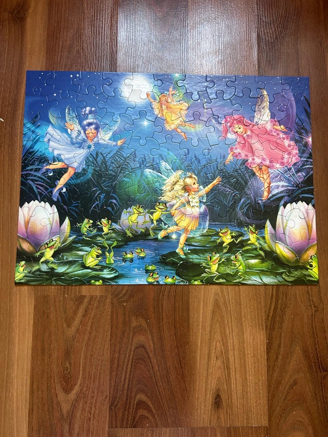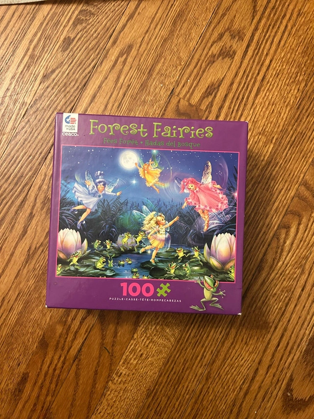 Dive into a magical world with this Ceaco Forest Fairies 100-piece puzzle, perfect for a cozy afternoon activity. The puzzle is in used but good condition, ready to be assembled and enjoyed. It features a vibrant scene of fairies and enchanted forest creatures, offering a delightful challenge for puzzle enthusiasts.