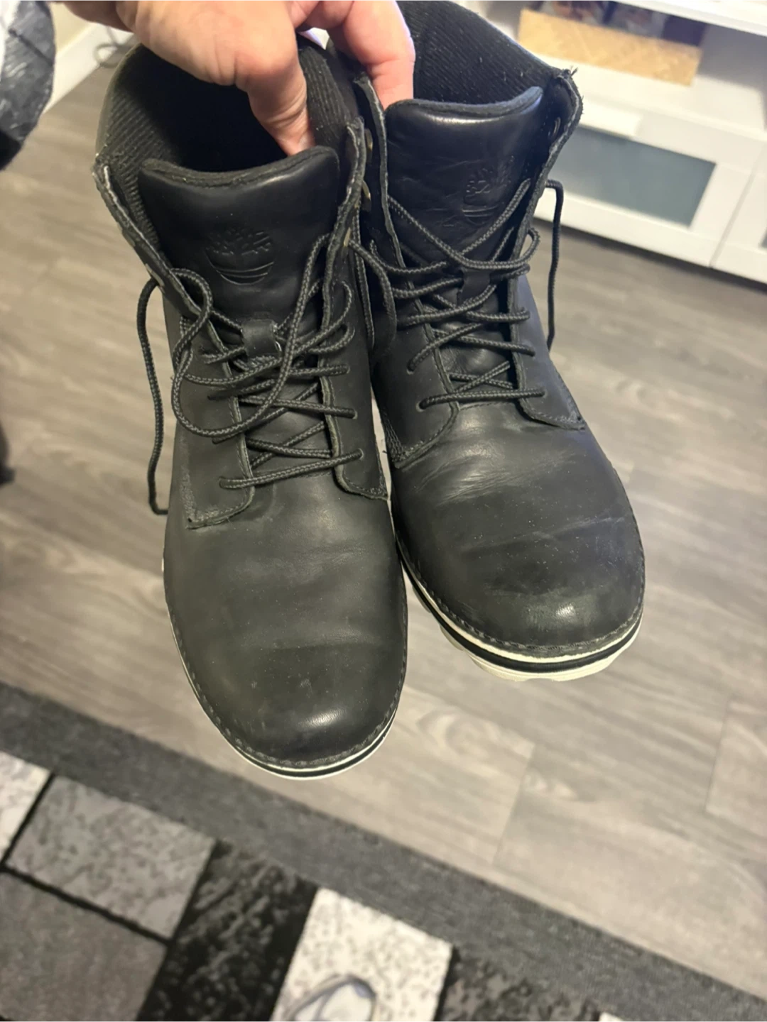Selling a pair of black Timberland boots. They're in good condition and ready for a new home! They have a classic look with a durable leather upper and a comfortable sole. Perfect for everyday wear!