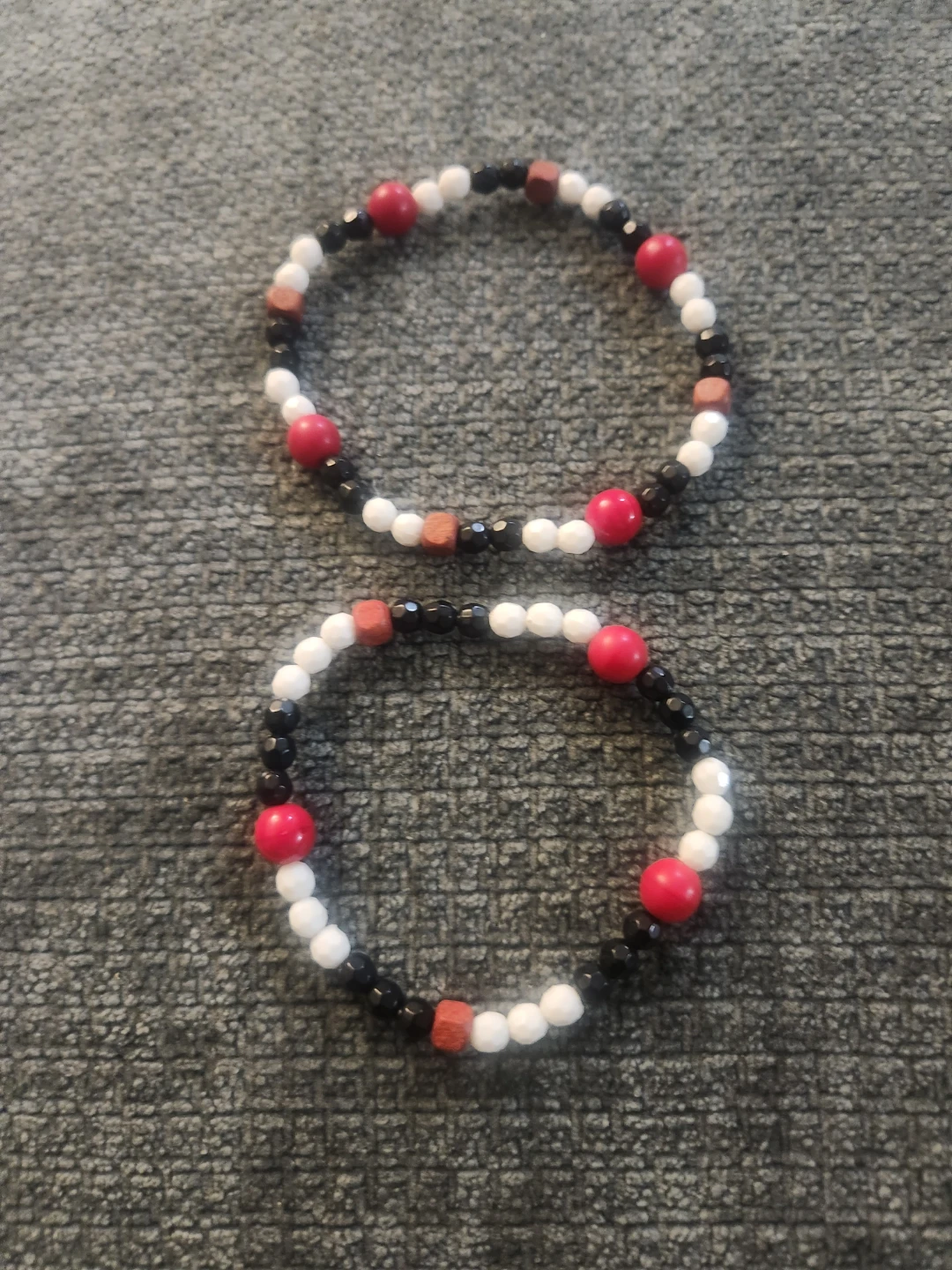 Selling a set of two beaded bracelets. They feature a mix of red, white, black, and brown beads. Perfect for adding a pop of colour to any outfit!