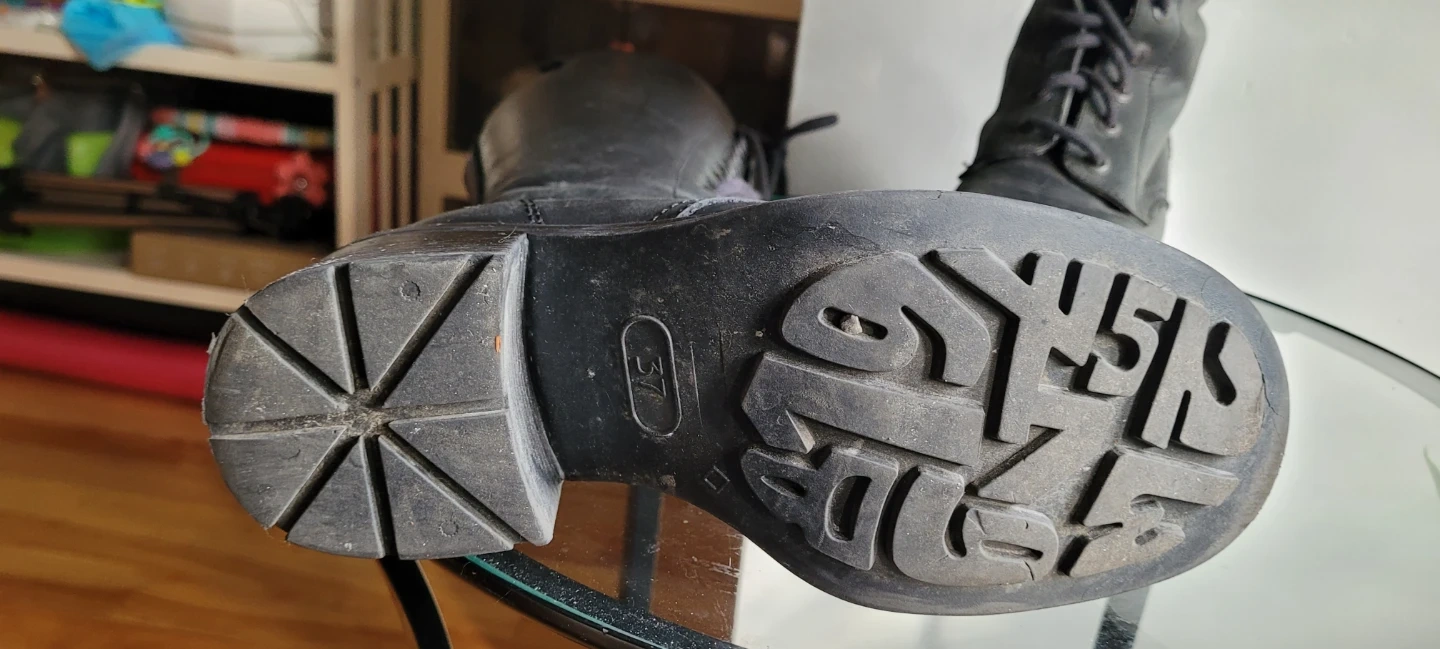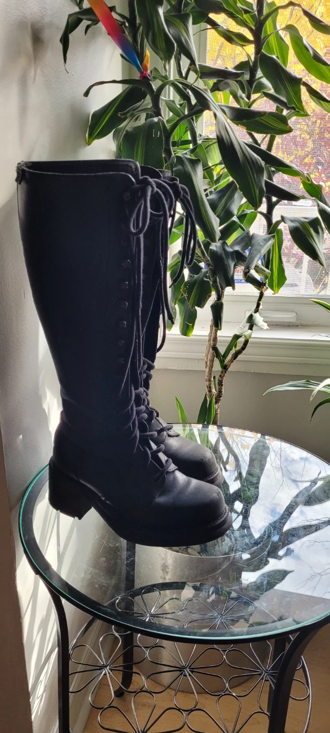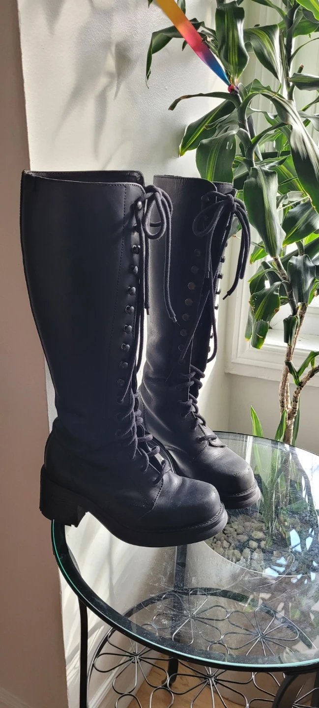 Selling a pair of black lace-up knee-high boots. They are in good condition and perfect for adding a bit of edge to your wardrobe. The size is 37 (European).