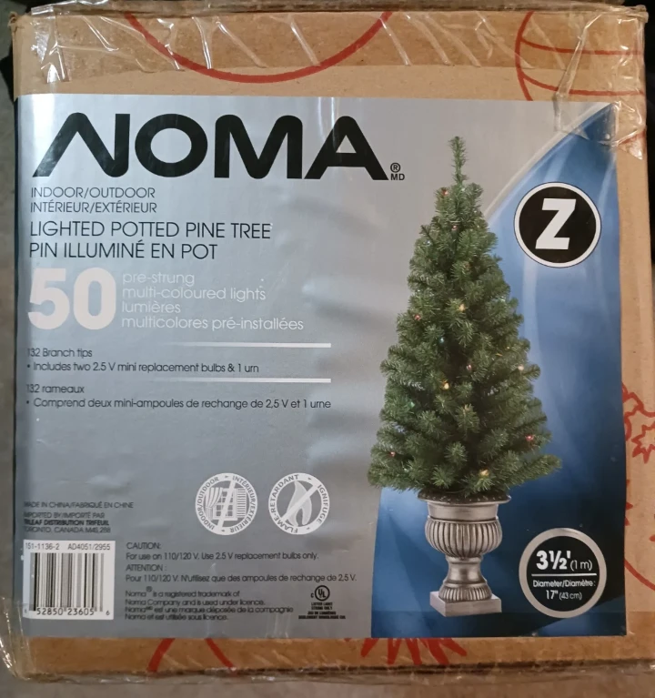 Selling a brand new NOMA indoor/outdoor lighted potted pine tree! It comes in its original box and includes 50 pre-strung multi-coloured lights. It also includes two 2.5 V mini replacement bulbs. The tree is 3 1/2' (1 m) in diameter/Diamètre 17" (43 cm)