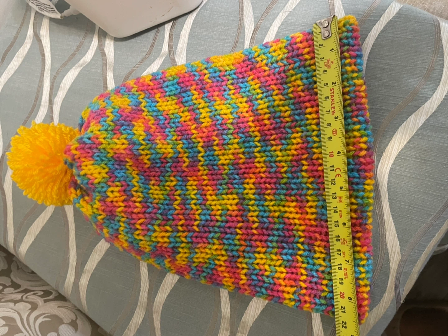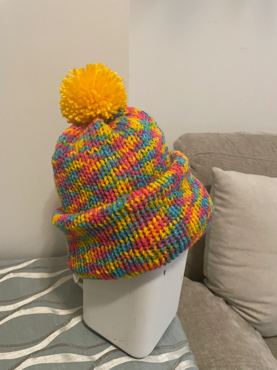 This adorable hand-crocheted beanie is sure to keep you warm and stylish! It features a vibrant rainbow of colours and a fun yellow pompom on the top two layers for more warmth. It looks to be about 10 inches long, handmade crochet work