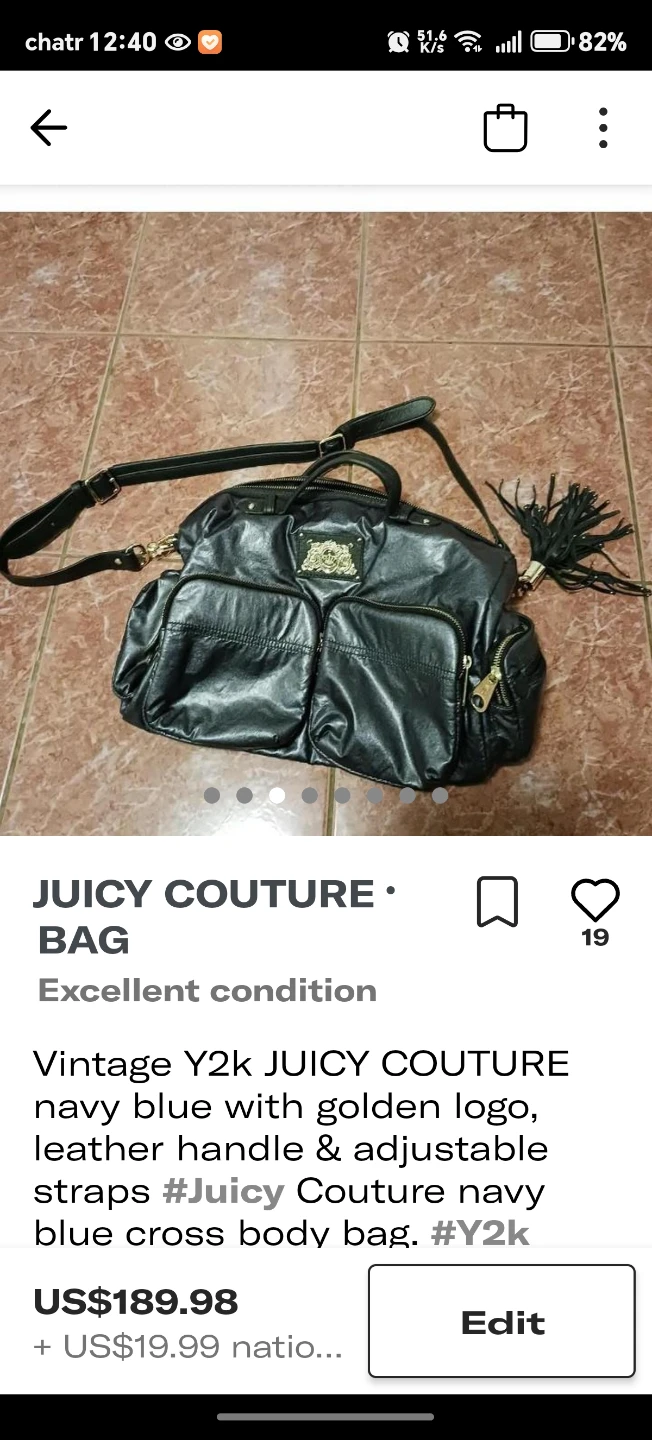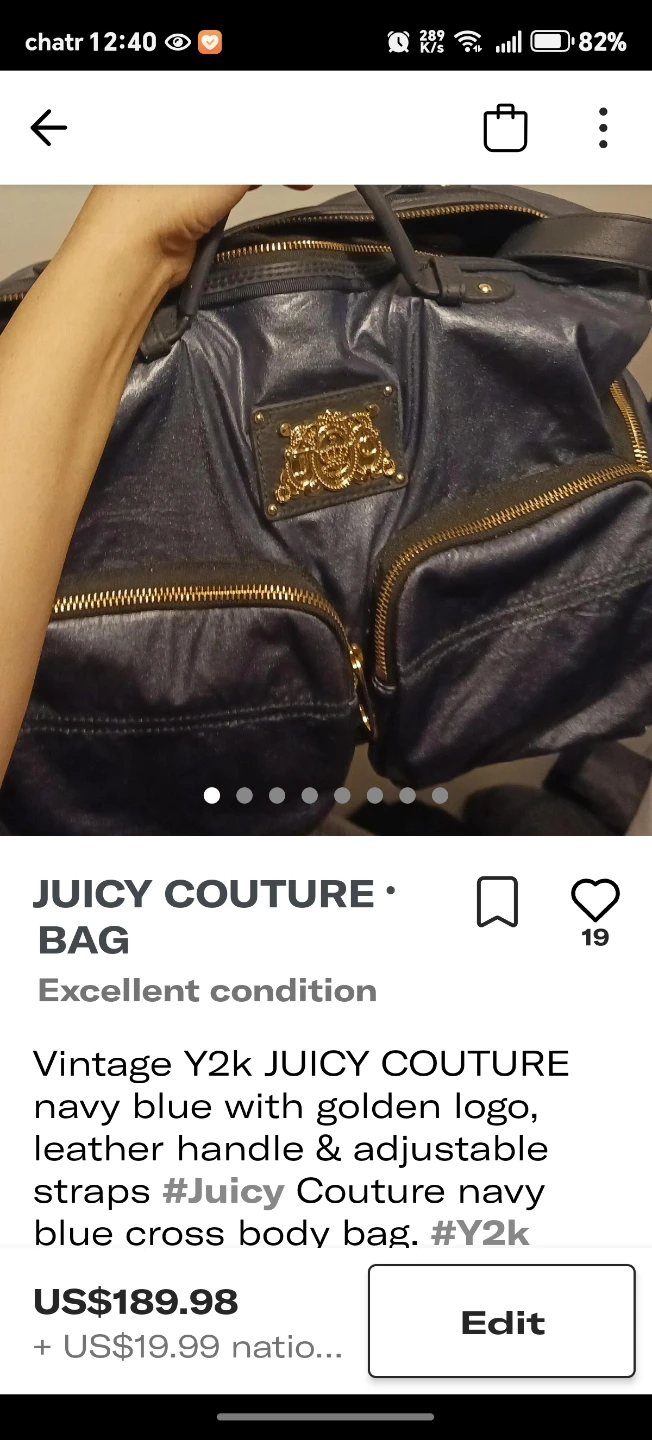 Selling a vintage Y2K Juicy Couture bag in navy blue! It has a golden logo, leather handle, and adjustable straps. It's in excellent condition and originally bought for $189.98 USD!