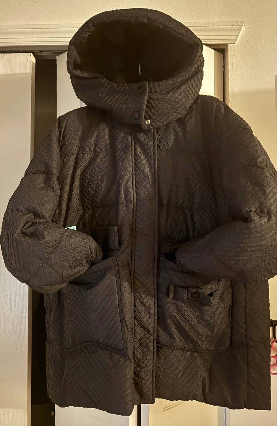Selling a stylish black padded coat with a hood! Woman’s small. It's perfect for staying warm and cozy during colder weather. The coat features a unique textured design and convenient pockets. It's in great condition and ready for a new home