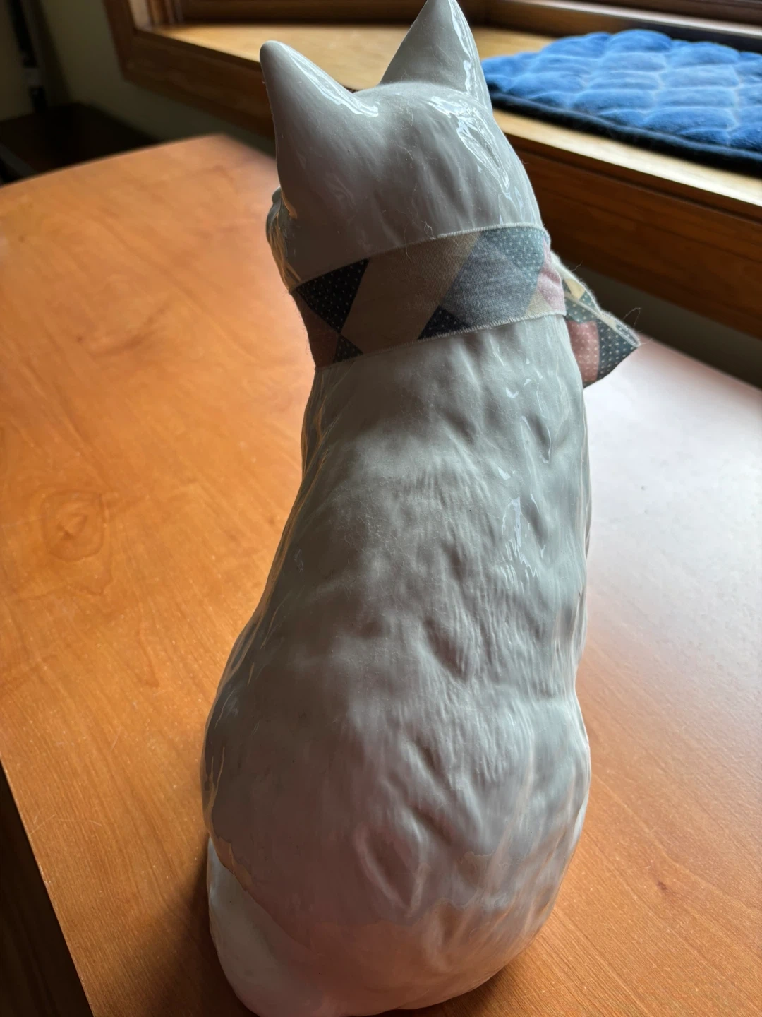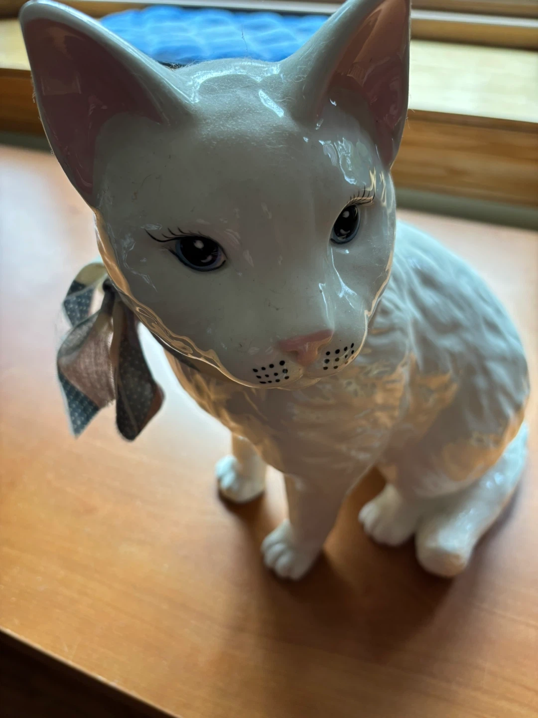 Here's a lovely white ceramic cat figurine! It's in great condition and would look great on a shelf or table. The cat has a cute ribbon around its neck and adorable eyelashes.