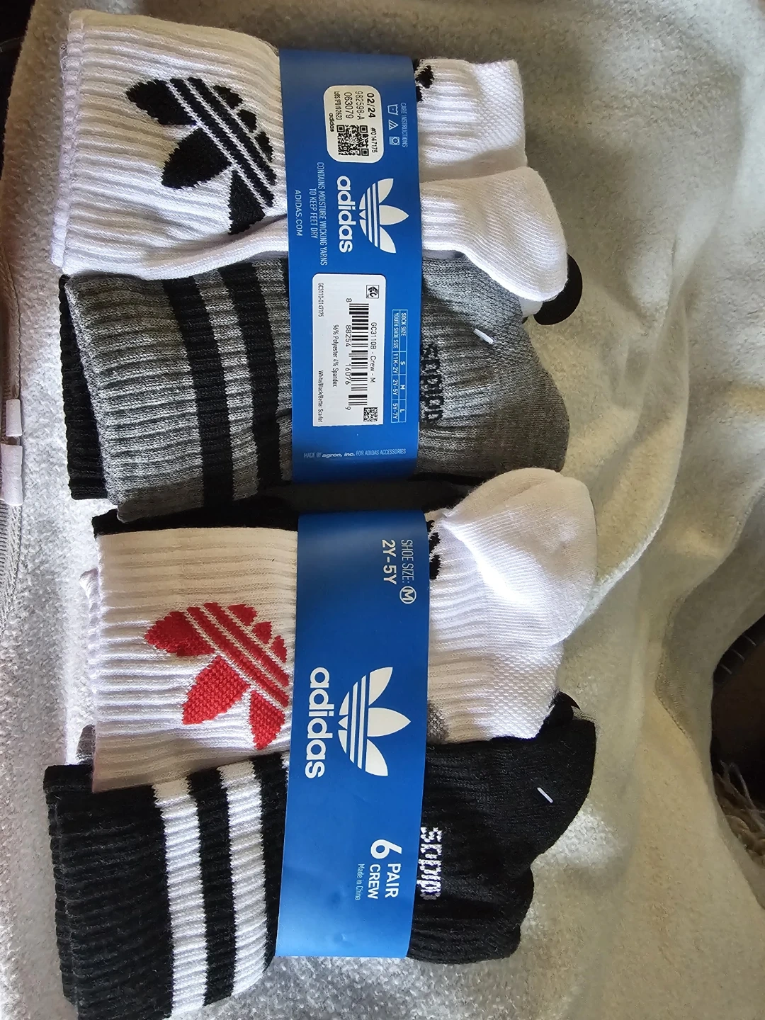 Selling a pack of Adidas crew socks for kids! These are size Medium, which fits sizes 2Y-5Y. The pack includes 6 pairs of crew socks in assorted colors and designs. Perfect for keeping little feet comfy!