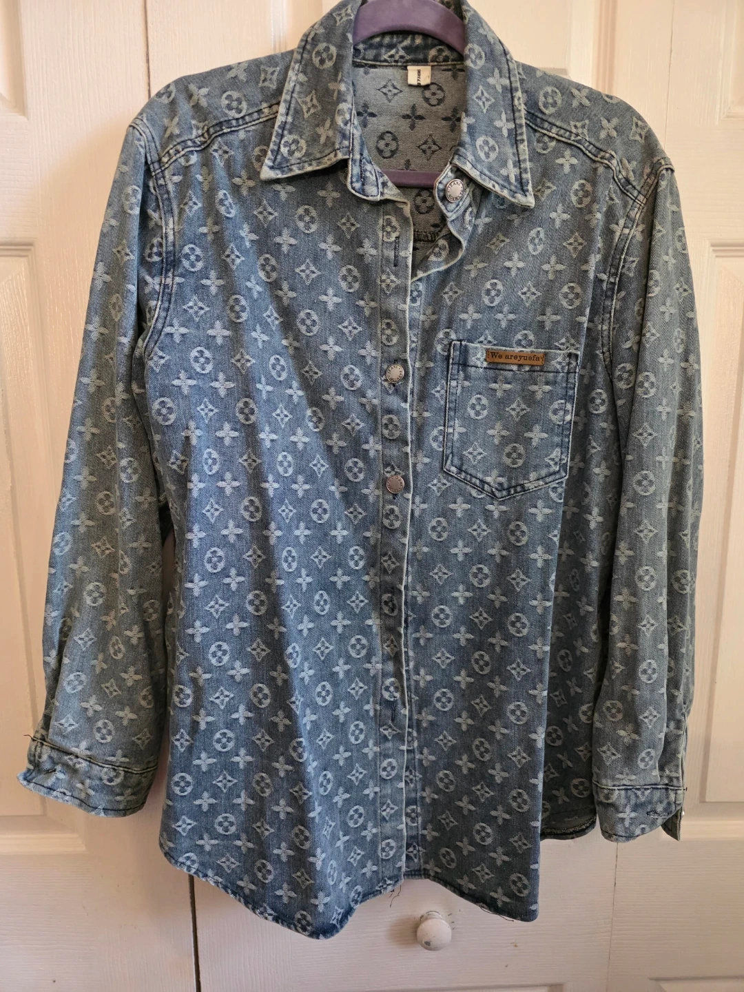 Here's a stylish denim button-up shirt with a unique pattern! The brand is We areayuefa. It features a classic button-up design and a cool denim material. Perfect for adding a touch of flair to your wardrobe