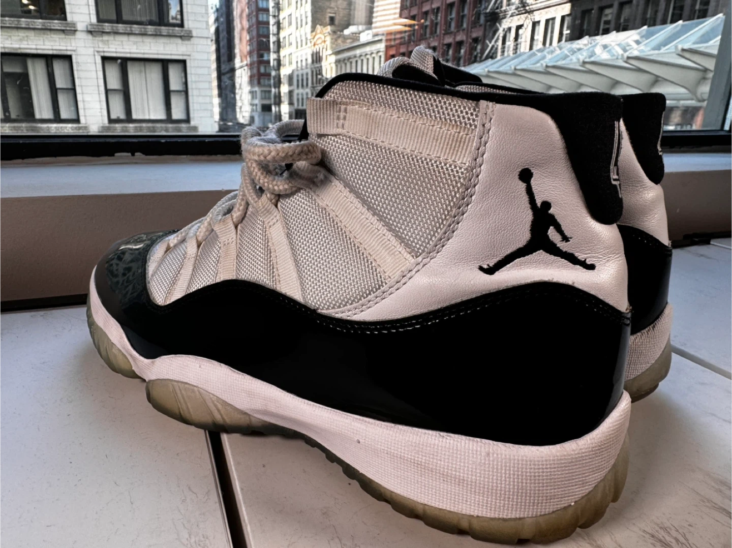 Selling a pair of Nike Air Jordan 11 Retro Concord sneakers. No Box They feature a classic black and white colorway with the number 45 on the heel.