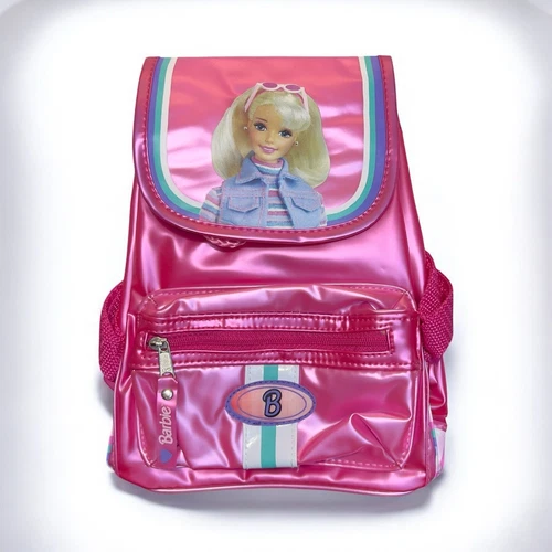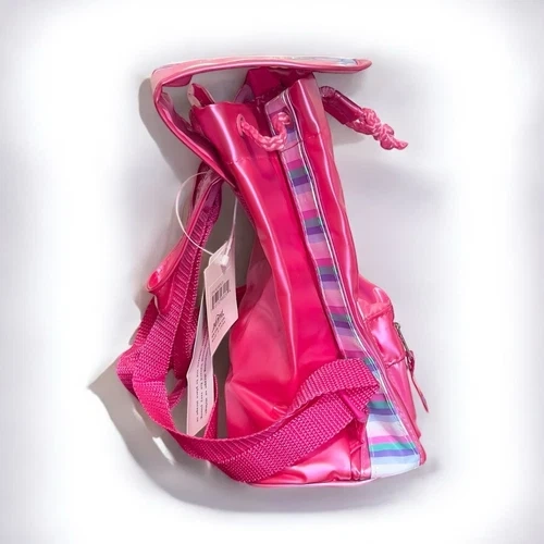 The *NWT* 2000 Barbie Backpack in pink is a stylish unisex kids accessory with drawstring closure and vinyl material. It features stripes on the sides, adding a trendy touch to the design. This Barbie-branded backpack is perfect for carrying school items or essentials while showing off a classic Barbie style from the year 2000. Perfect for young fashionistas looking to add a pop of pink to their outfit.