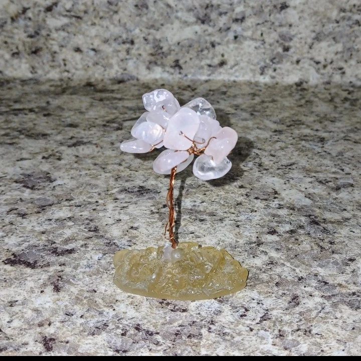 Add a touch of zen to your space with this beautiful rose quartz crystal tree. It's a unique piece of decor that brings a calming vibe to any room. The rose quartz stones are delicately arranged to resemble a blossoming tree, making it a lovely addition to your home or office