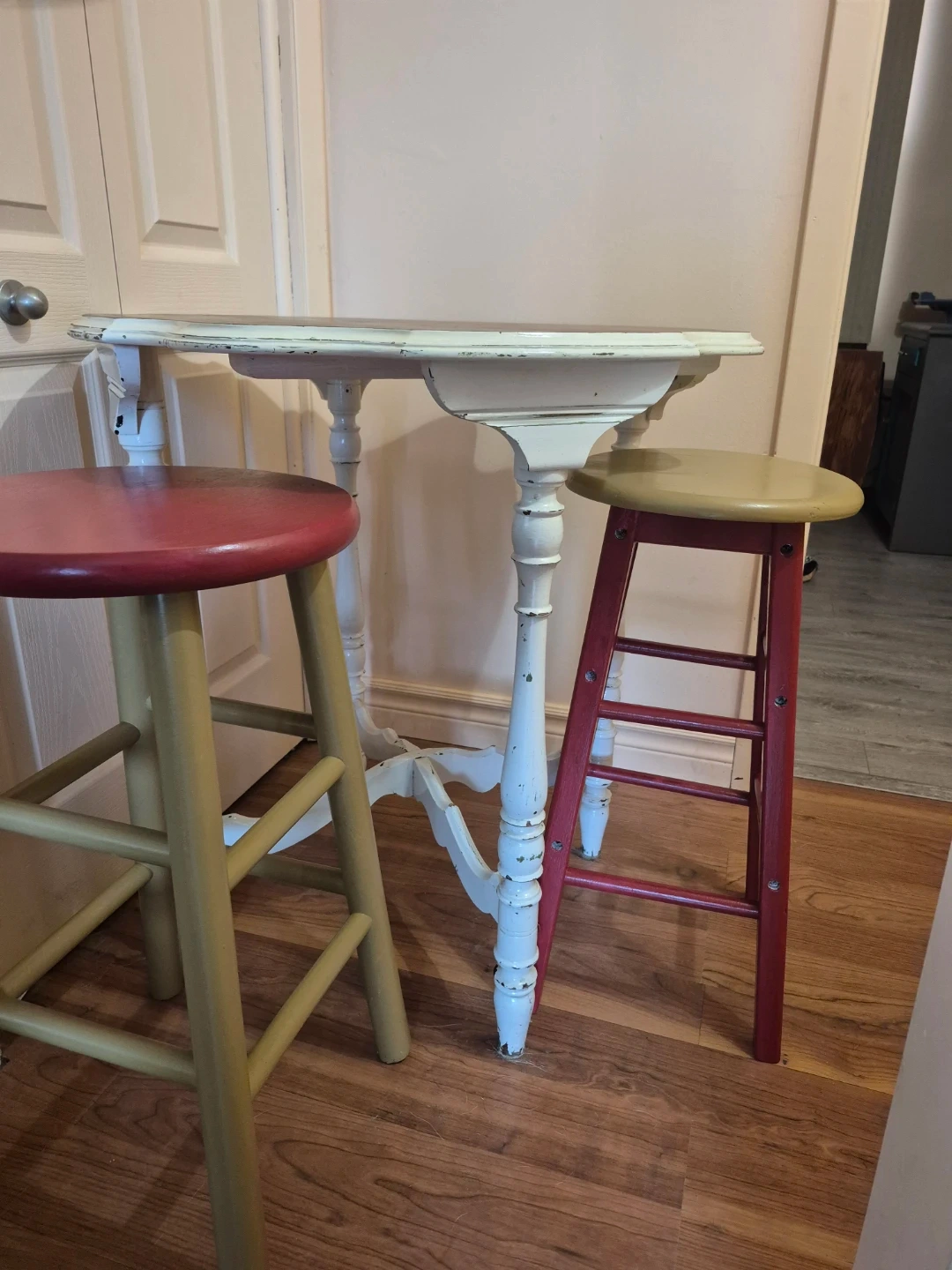 Selling a charming antique-style table. It comes with two stools, one red and one yellow. The table has a white painted base and a wooden top. Finished sabby sheet.