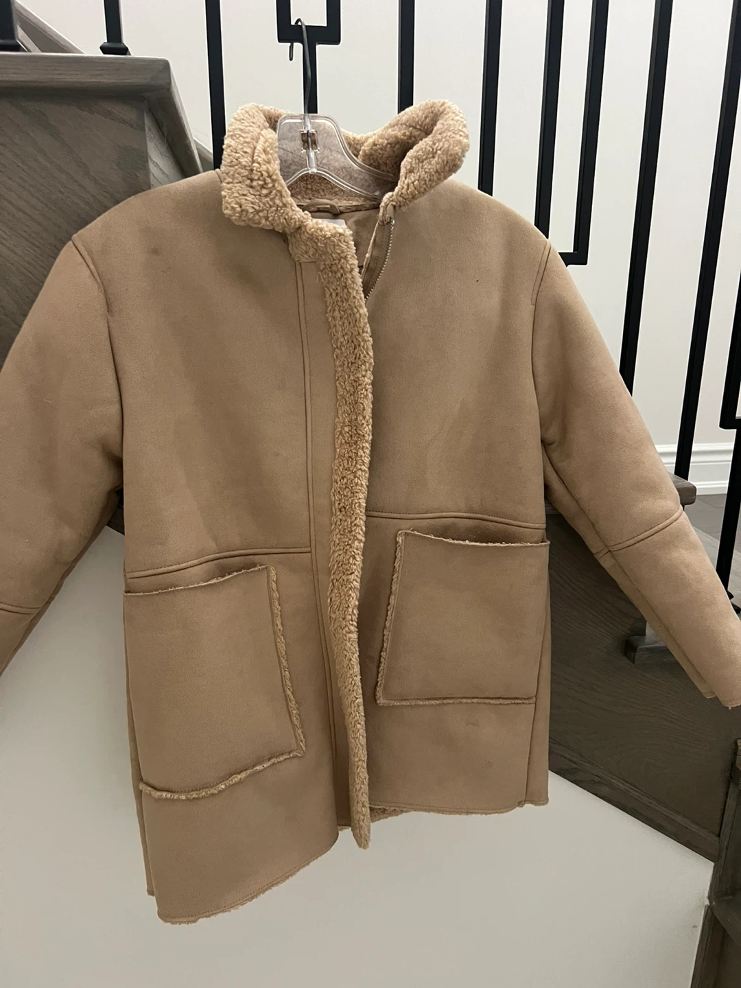 Cozy Zara kids sherpa jacket in great condition! It's a size 10 and perfect for keeping warm on chilly days. The jacket has a soft, faux-suede exterior and a fluffy sherpa lining. It's a stylish and practical addition to any kid's wardrobe!