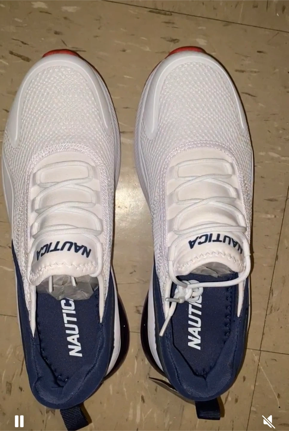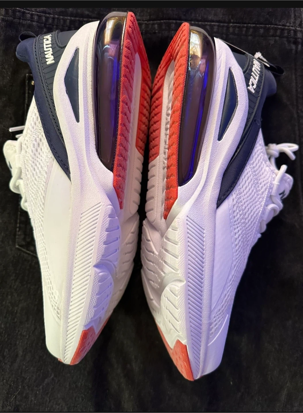 These are a pair of white Nautica sneakers. They feature a navy blue interior and red accents on the soles. Brand new condition for men or woman.