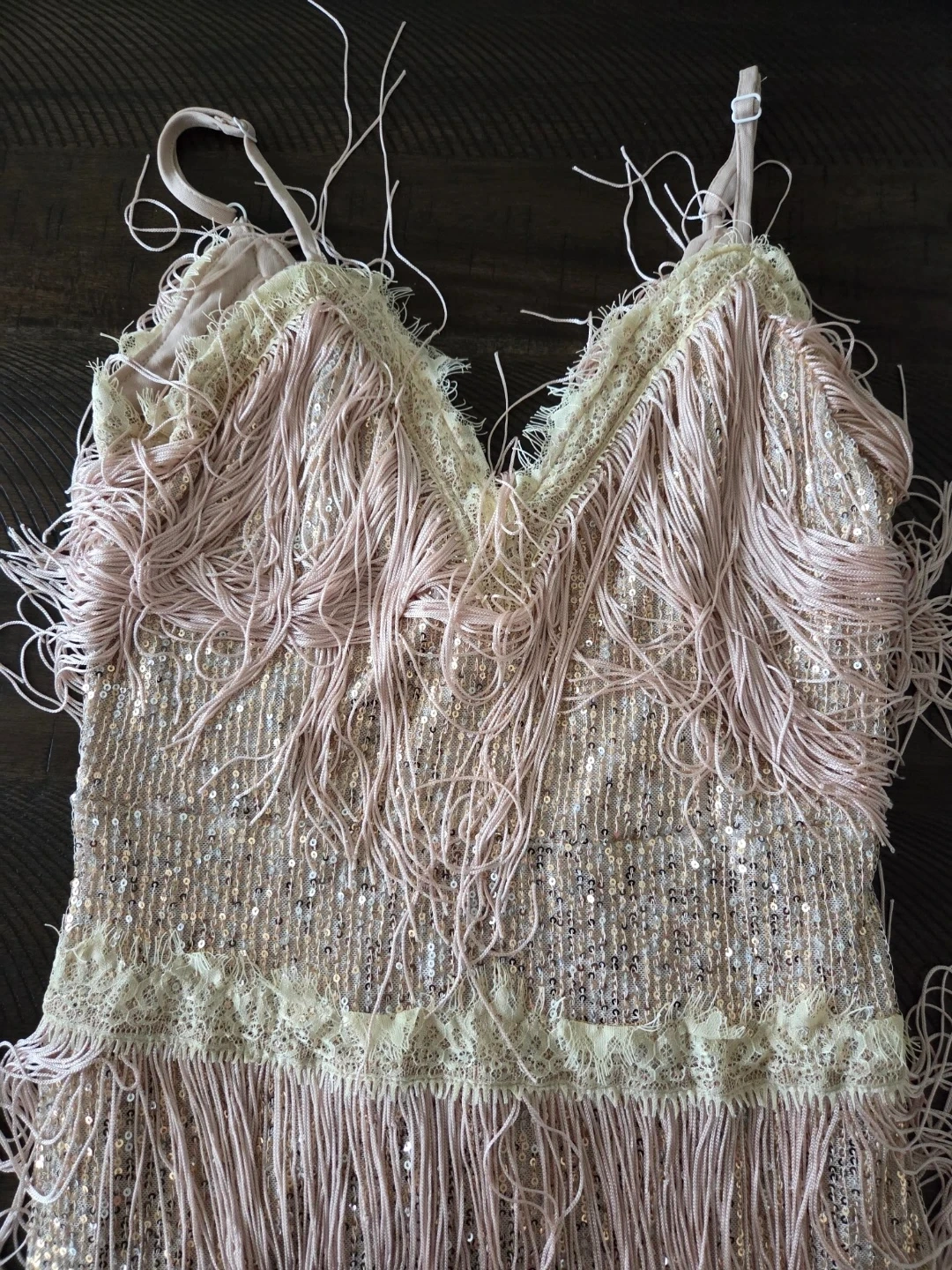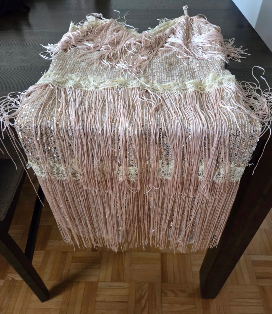 Get ready to dance the night away in this fun and flirty fringe dress! It features sequins and a unique design that's sure to turn heads. Perfect for parties or special occasions! Only worn once! Pick up Shoppers at King and Hurontario, Mississauga and cash only.