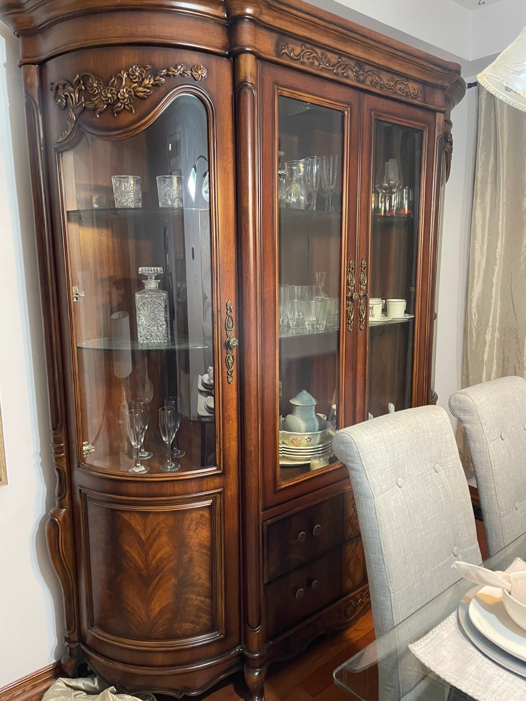 Selling a wooden china cabinet. It has glass doors and shelves, perfect for displaying your favourite dishes and glassware. It also has drawers for storage, and a switch light for display