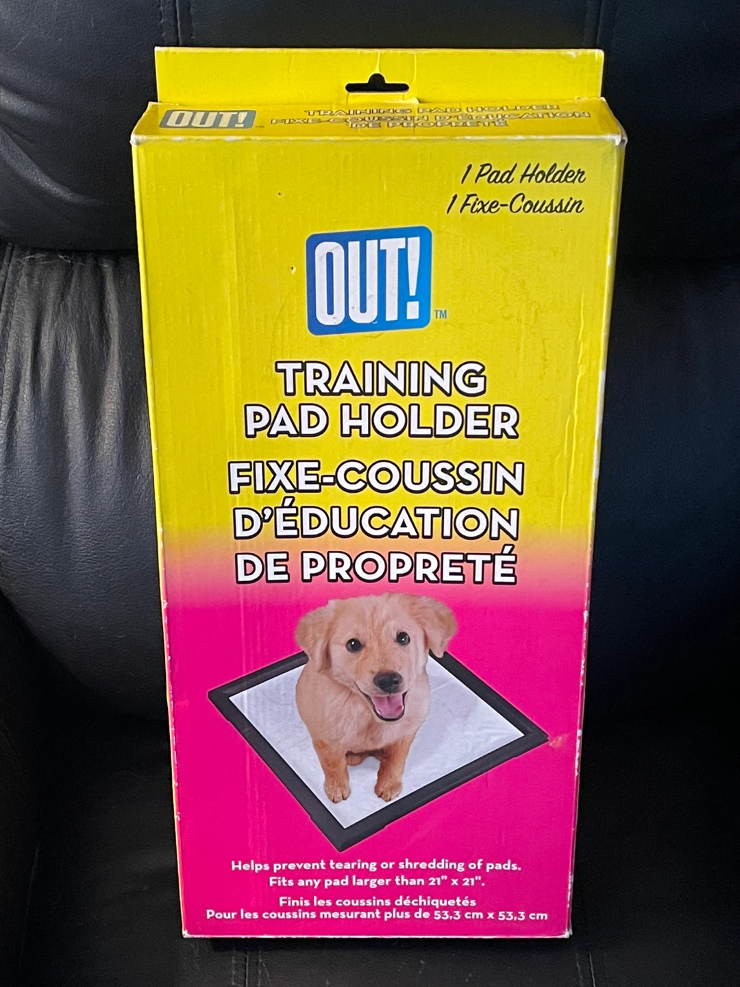 Selling a brand new OUT! Training Pad Holder. It helps prevent tearing or shredding of pads and fits any pad larger than 21" x 21" (53.3 cm x 53.3 cm). Comes with the original box and assembly instructions.