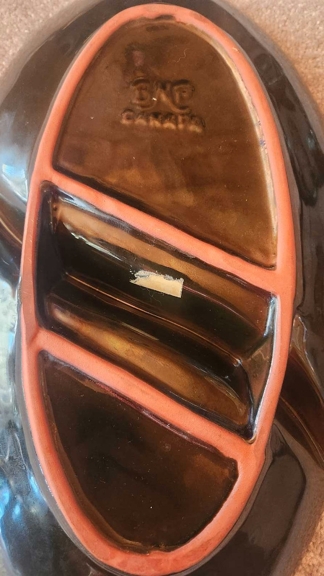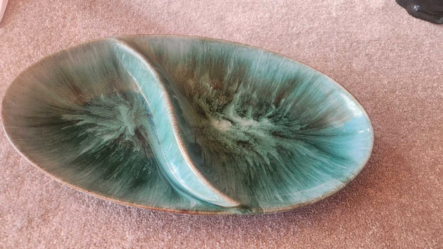 This is a used Blue Mountain Pottery divided serving dish, perfect for showcasing your favourite snacks with a touch of vintage charm. This unique piece features a stunning green and brown glaze, characteristic of Blue Mountain Pottery. Smoke Free Home