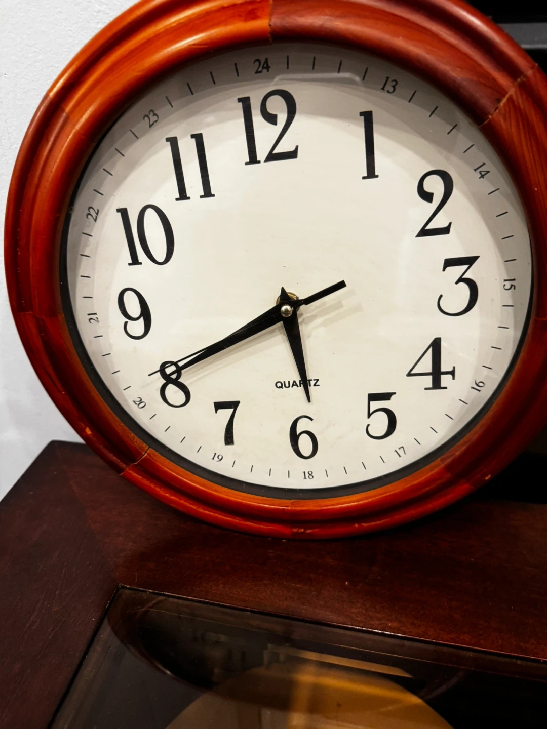 Here's a classic quartz wall clock featuring a warm wooden frame! It's perfect for adding a touch of traditional charm to any room. The clock face is easy to read with bold numbers. It's in great condition and ready to keep time in your home