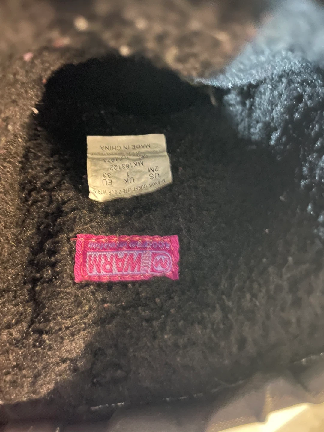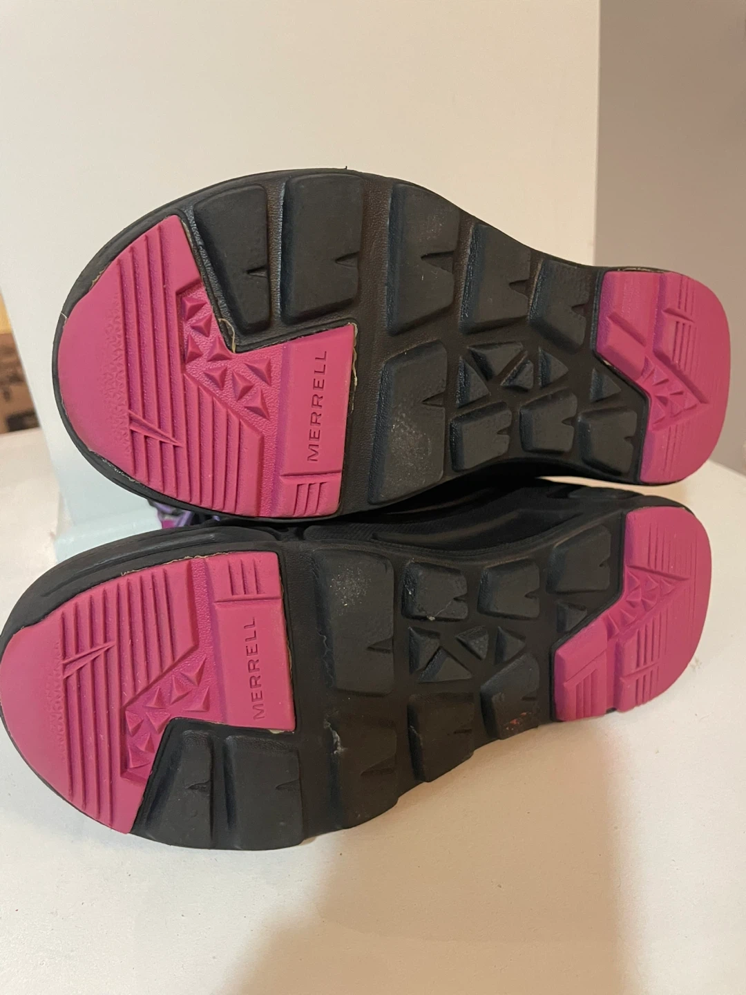 Selling a pair of Merrell Snow Quest Lite 2.0 winter boots in a US size 2. These boots are black with purple and pink accents. They're in good condition and ready for some winter fun!