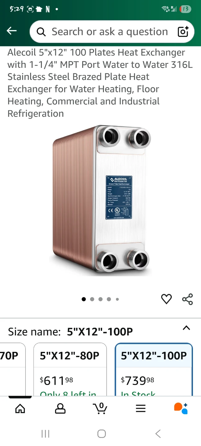 Selling an Alecoil 5"x12" 100 Plates Heat Exchanger. It's designed with 1-1/4" MPT Port Water to Water 316L Stainless Steel Brazed Plate, perfect for water heating, floor heating, commercial and industrial refrigeration. Retails for $739.98