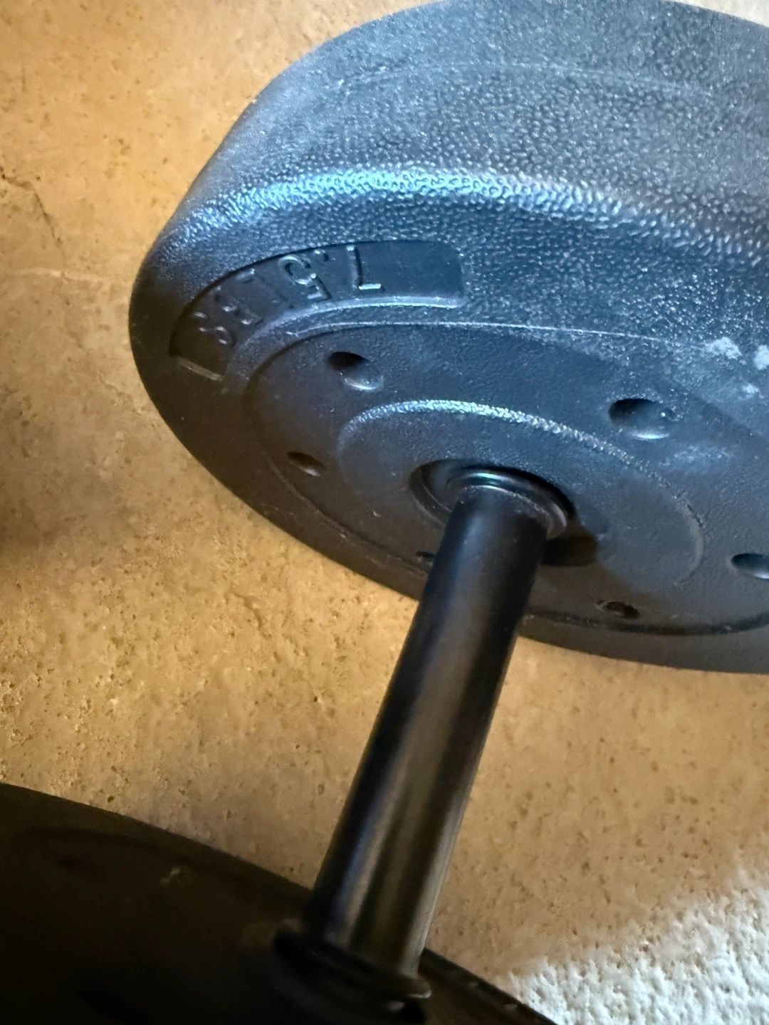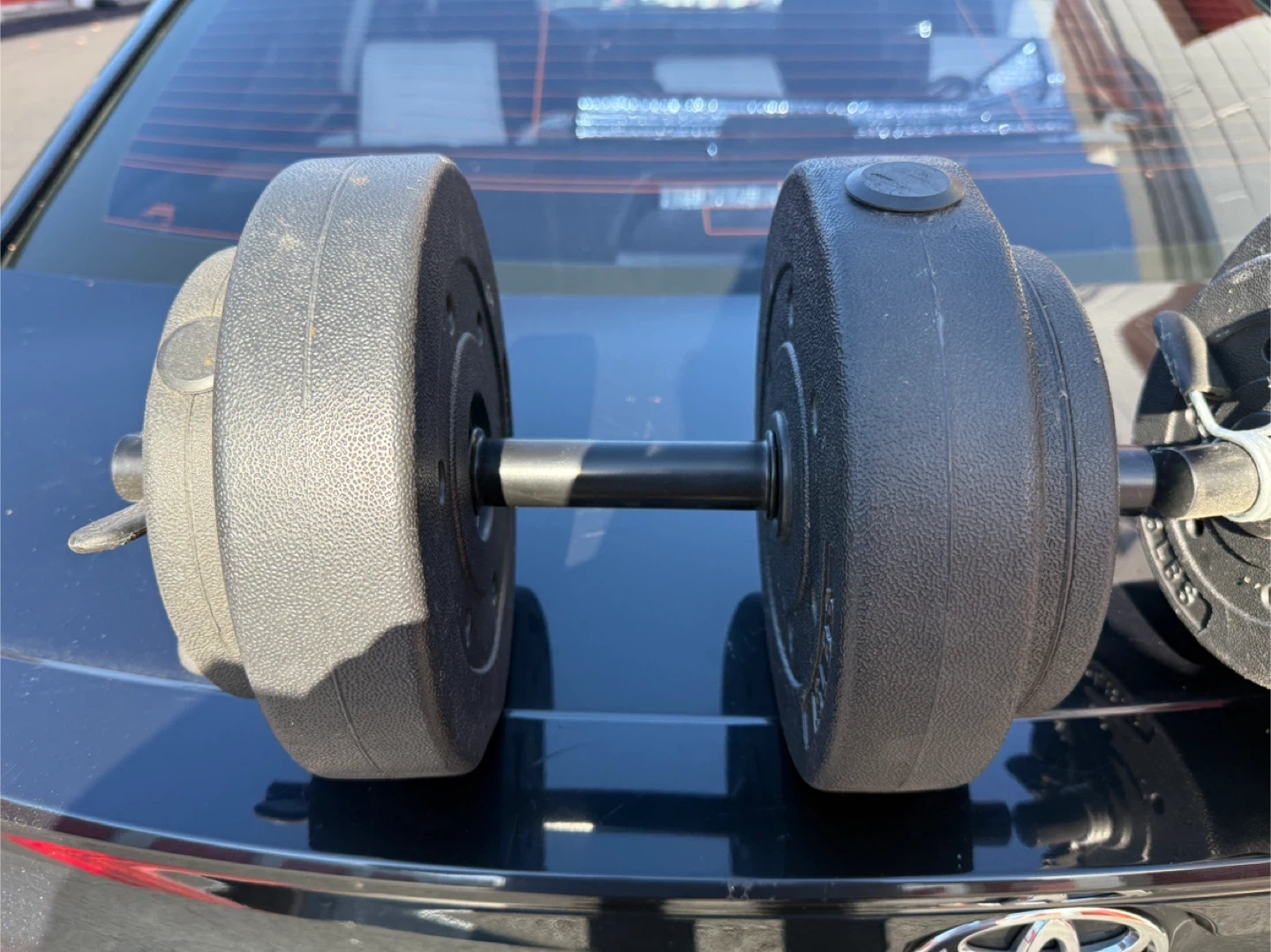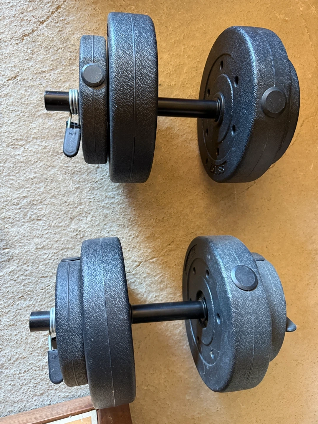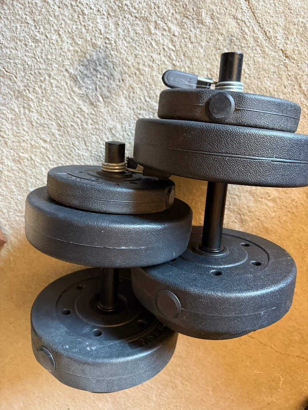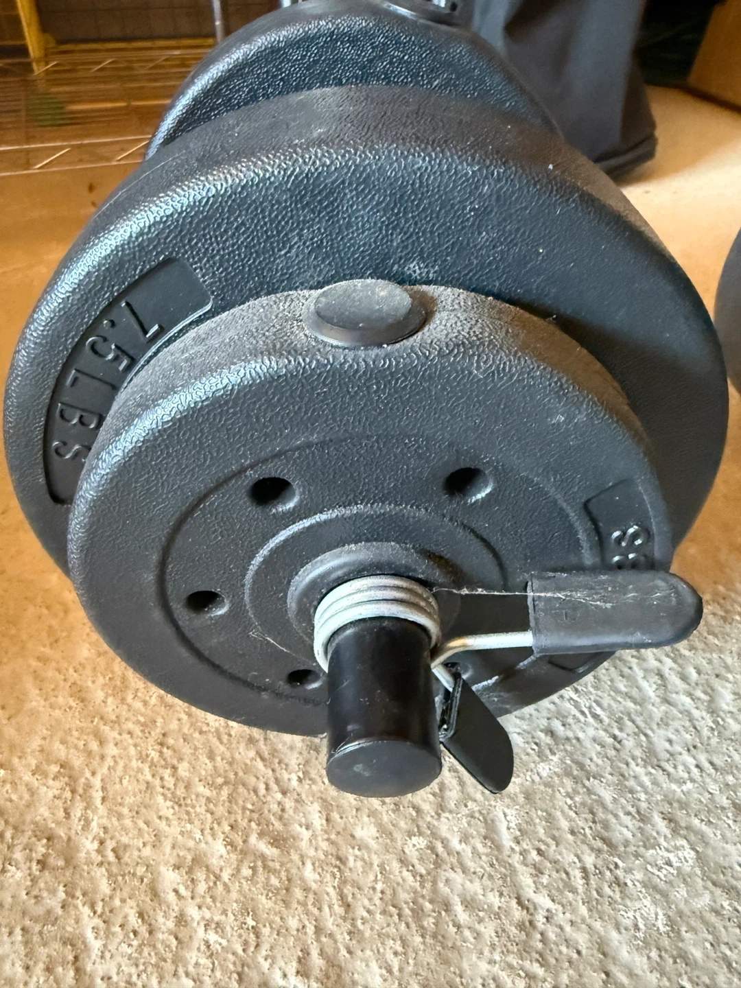 Adjustable Dumbbell Set Selling a set of adjustable dumbbells. Each dumbbell has plates weighing 7.5 lbs and 2.5 lbs each. Great for home workouts! 40lbs
