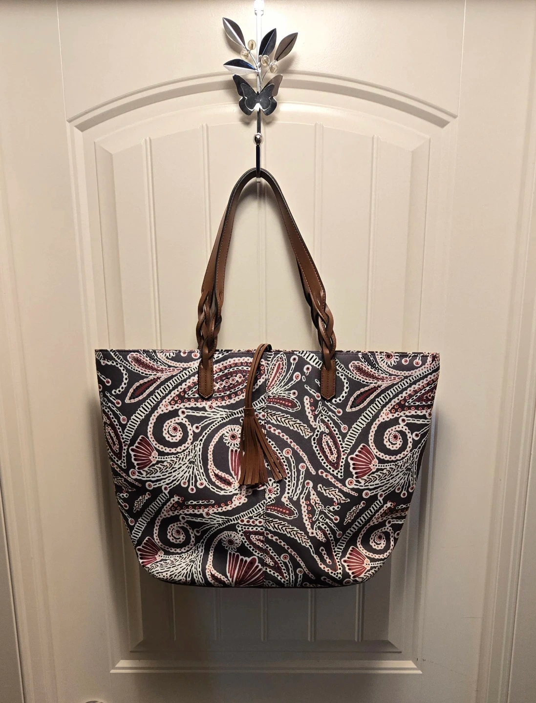 Excellent condition. 13" tall, 18" wide and 5" depth. Stylish tote bag featuring a unique paisley print and brown handles. Perfect for everyday use, shopping, or an accessory to complete your outfit. Inside is lined with a deep red fabric, and there's a handy pocket inside.