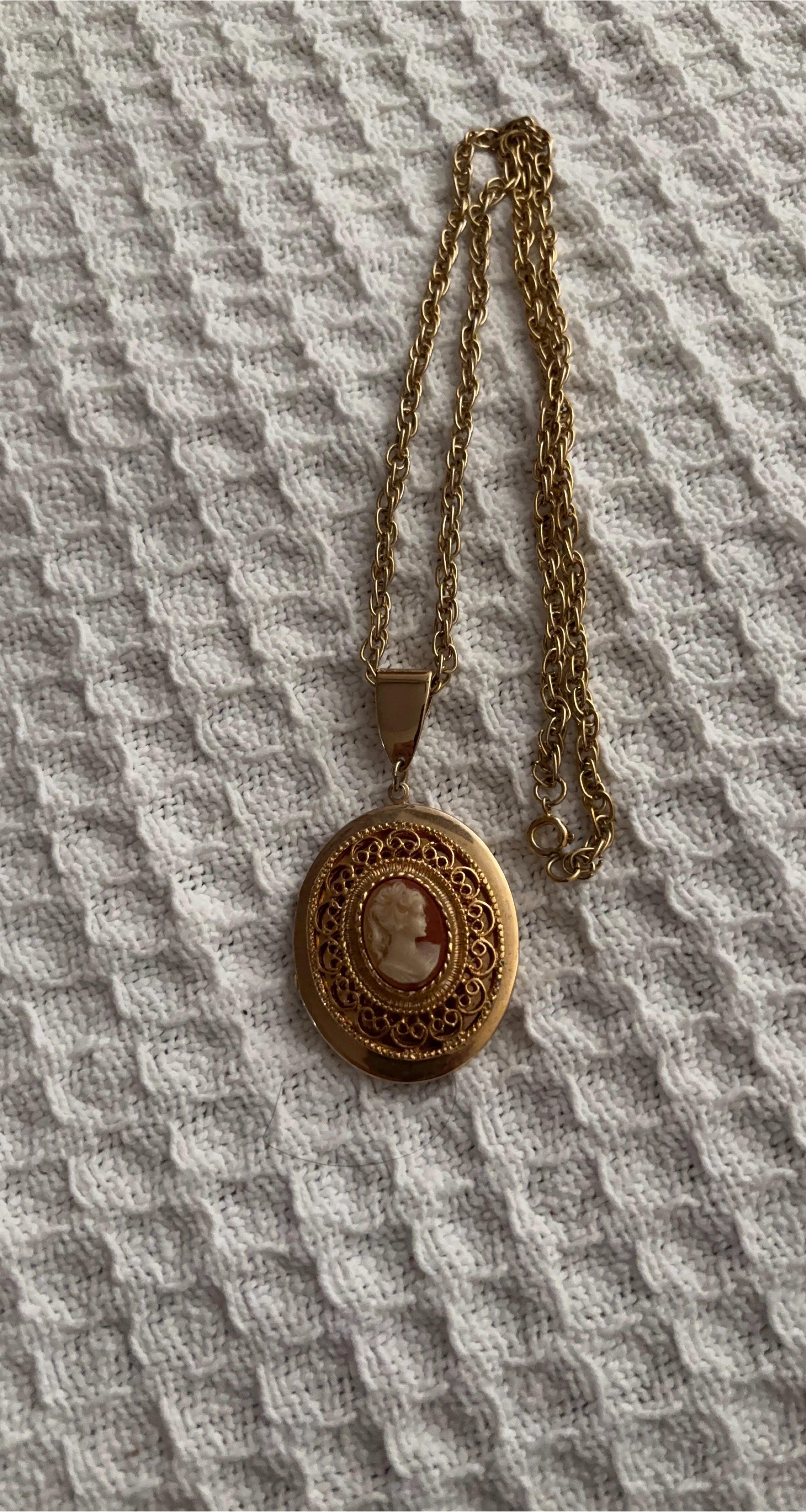 Selling a lovely vintage gold-tone cameo pendant necklace. The pendant features a detailed cameo design set within an ornate, filigree-style frame. The chain is a classic gold-tone link style. It's a beautiful piece to add a touch of vintage charm to any outfit