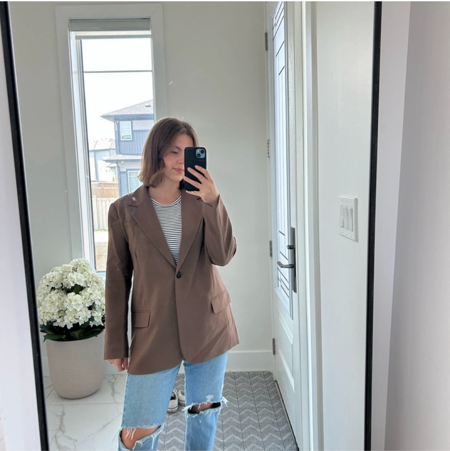 A stylish brown blazer, perfect for adding a touch of sophistication to any outfit. It's in great condition and ready for a new home.