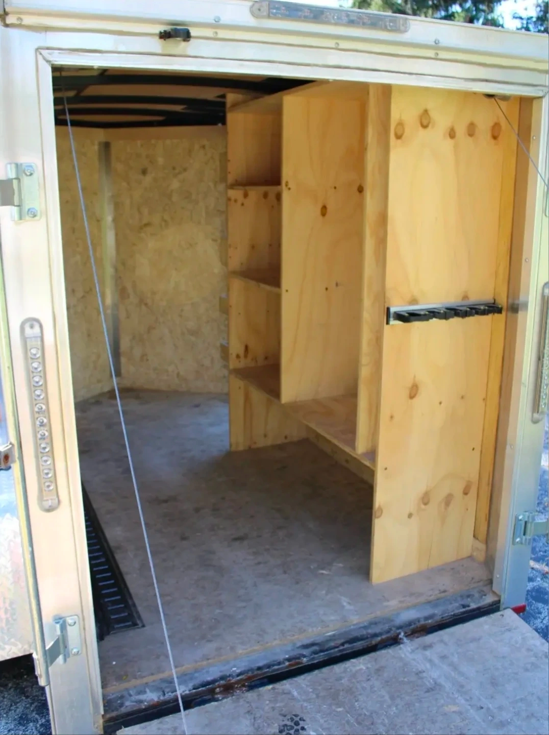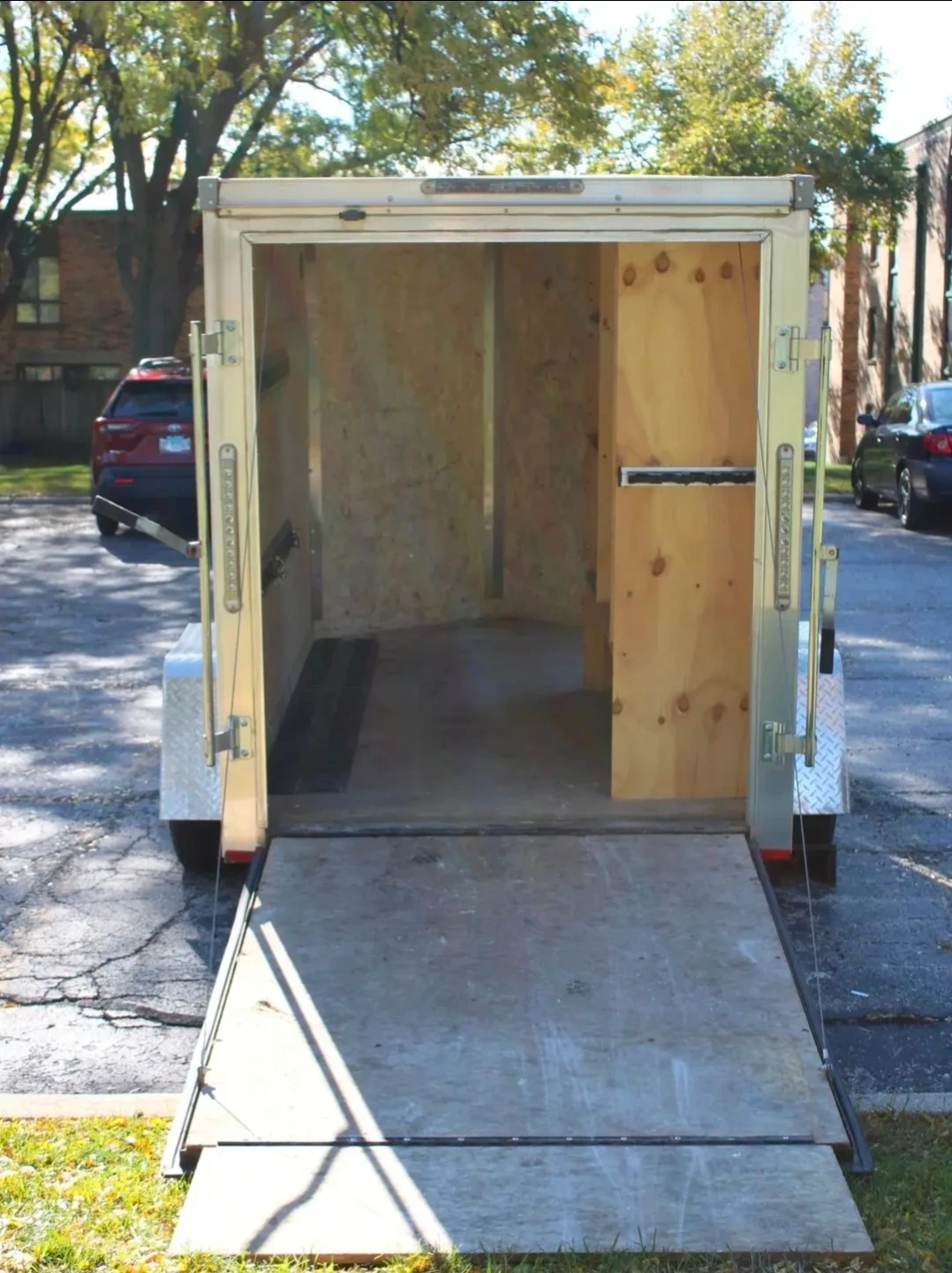 I'm selling my trailer for a reason: I bought a larger one for remodeling work and need more space. As you can see, it has built-in drawers that can be removed if you wish. The trailer is in good condition; you can come and check it out whenever you want. All the lights and signals work perfectly. I have two types of adapters in case the connection isn't compatible with your vehicle. The trailer measures 9 x 5 x 5.5 meters from the front to the back, and 8 x 5 x 5.5 meters from the corner where the side door is to the back.