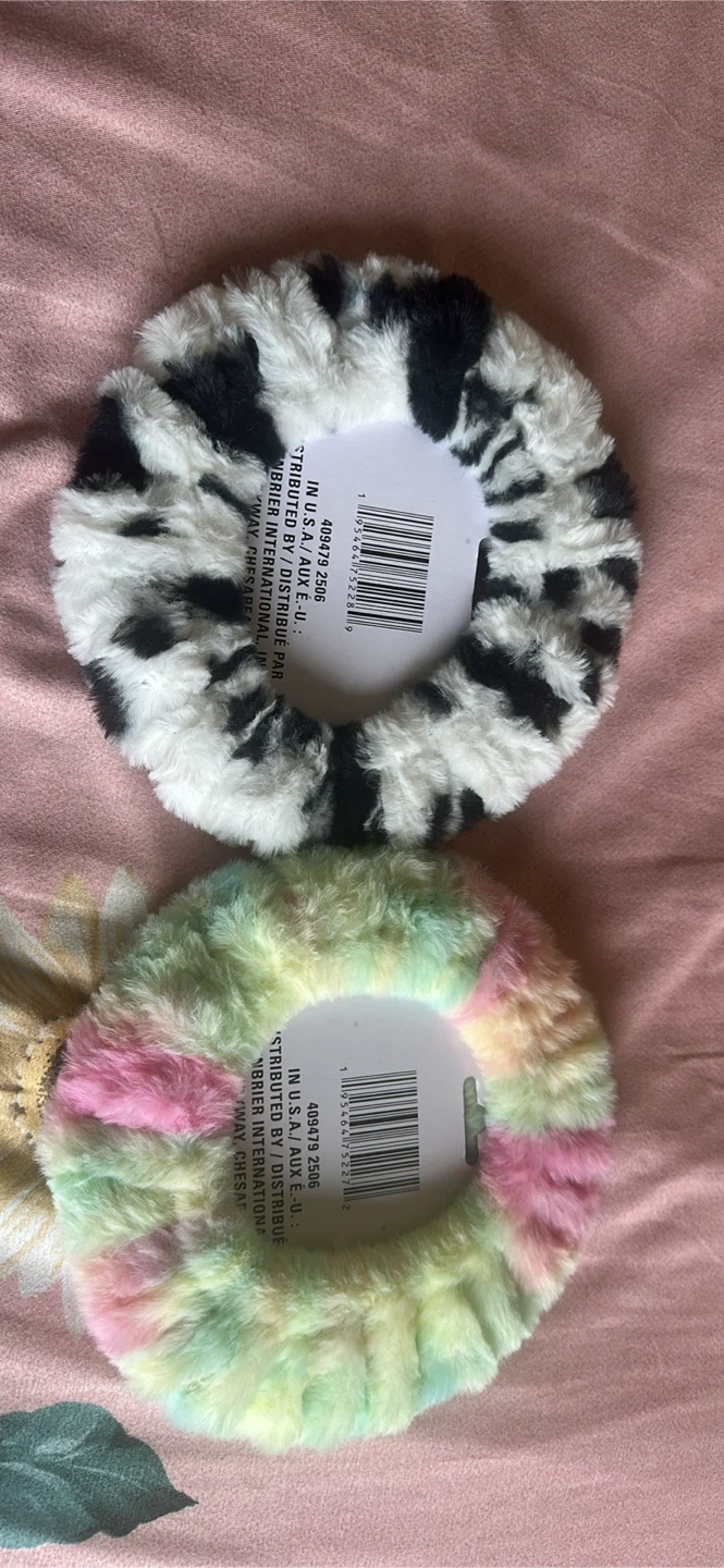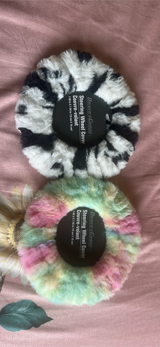 Two fuzzy steering wheel covers! One is black and white cow print, and the other is pastel tie dye