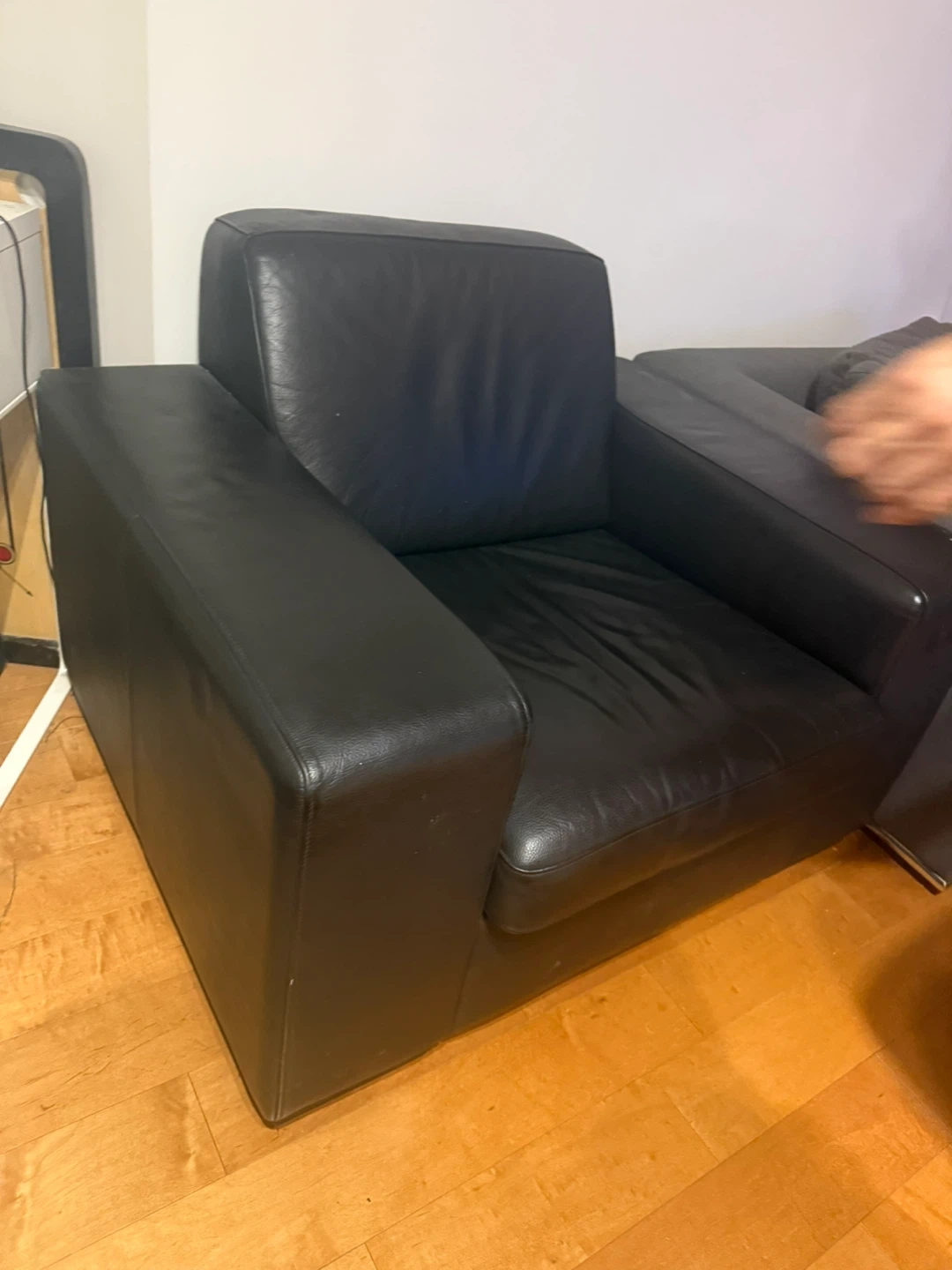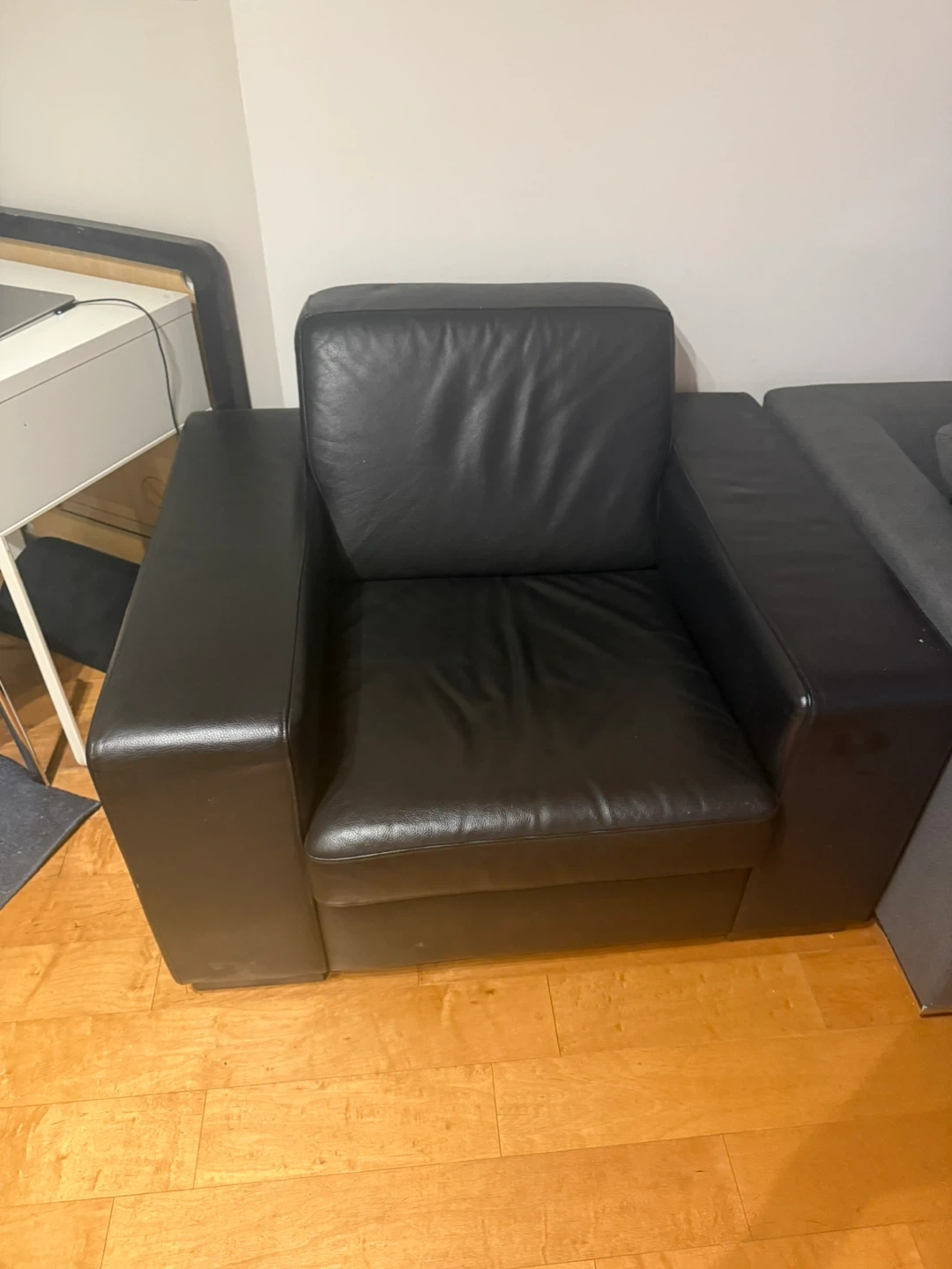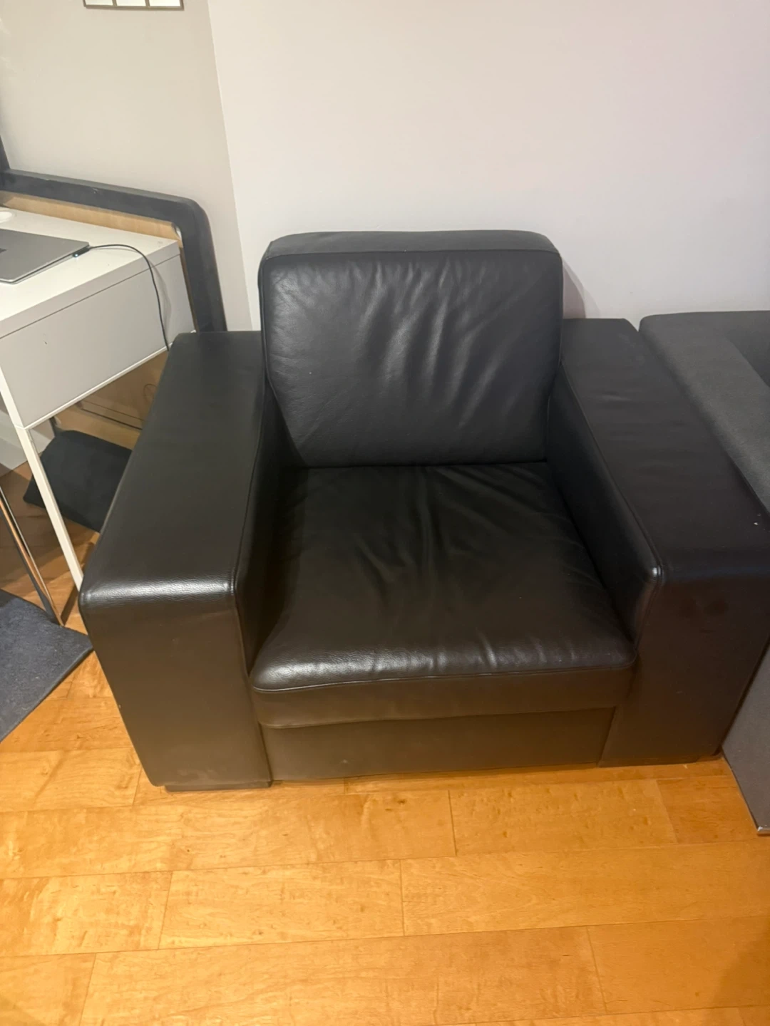Selling my black leather armchair — it’s in good used condition and super comfortable. The design is modern and minimal, with wide arms and a sturdy frame. No tears or major scratches, just normal wear from regular use.