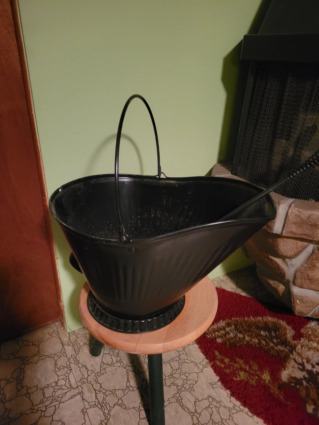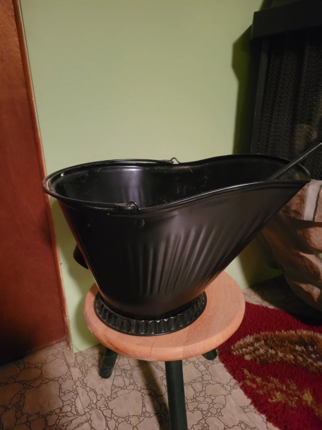 Here's a black fireplace coal bucket. It's in good condition and ready to use next to your fireplace or wood stove