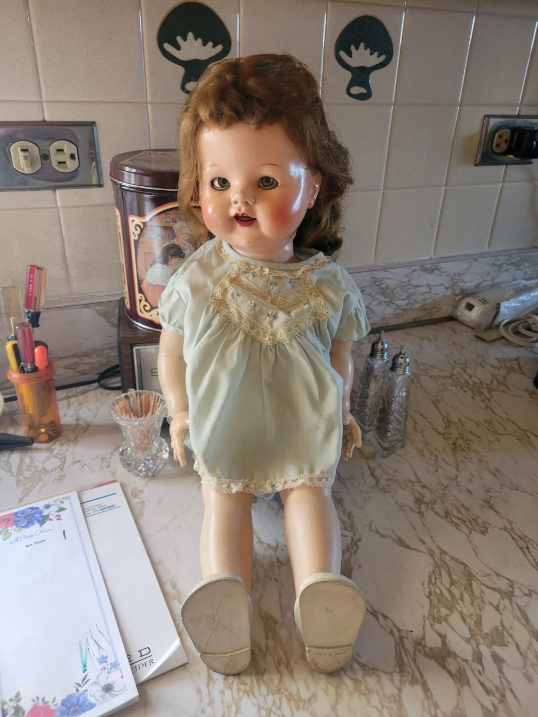 Selling a vintage doll wearing a light blue dress with lace detailing. It's a charming piece for collectors or anyone who appreciates vintage toys! The doll has a classic look with painted features and rooted hair.